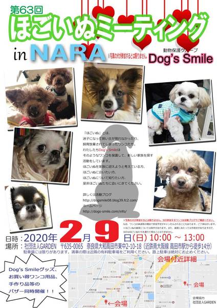 | イベント内容 | 2月9日(日曜日)、奈良県大和高田市内にて「第63回ほごいぬミーティング」を開催します。 保護犬を家族に迎えようと考えている方、保護犬に会ってみたい方、保護犬について知りたい方、ぜひご来場ください。 相性を見るためなど先住わんこさん、卒業わんこさんのご参加ももちろんOKです。 当日は、Dog's smileグッズやワンコ用品の販売、Dog's smileを応援してくださる方々が手作りされた手作り雑貨などの販売も行います。どれもお買い得です。 また、売り上げは、私たちの活動資金になります。ぜひご協力をお願いします。 なお、来場予定のワンコについては、活動ブログをご確認ください。 日時 令和2年1月12日(日)午前10時~午後1時 場所 一般財団法人ワンネスグループ奈良GARDEN 奈良県大和高田市東中2丁目10-18 (近鉄南大阪線高田市駅から南西に徒歩14分) 協力 一般財団法人ワンネスグループ 2月のほごいぬミーティングは、第2日曜日の2月9日(日)、同じく奈良GARDENの施設をお借りして開催する予定です。 |