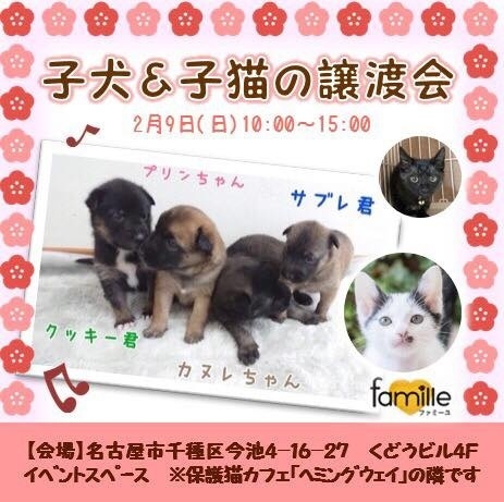 | イベント内容 | NPO法人ファミーユ 子犬子猫に是非会いに来てくださ〜い! ・会場は地下鉄今池駅4番出口から徒歩3分 ・車の方は近隣にコインパーキングがたくさんあります ・お値打ちなバザー用品も販売してます *正式譲渡の前にトライアル期間を設けておりますので、「先住ペットとの相性が心配」という方は、 トライアル期間中にじっくりご検討くださいね *わんこやにゃんこの体調によっては、当日参加できない場合があります *お見合いを希望される方は、ご予約いただけますと確実です <お問い合わせ先> info@npo-famille.org |