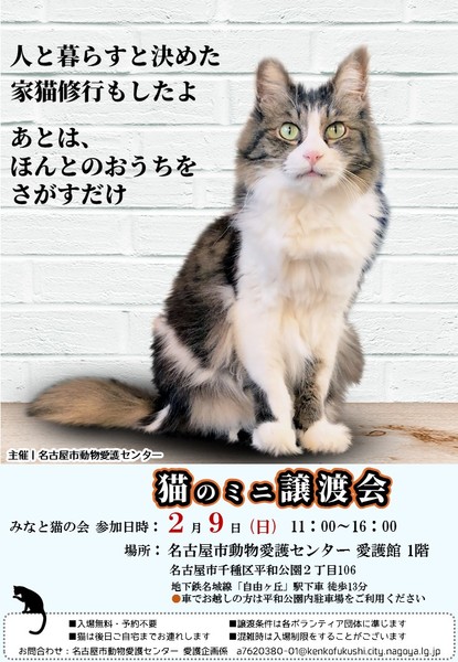 | イベント内容 | ★ミニ譲渡会★のご案内 【主催】 名古屋市動物愛護センター https://www.facebook.com/nagoya.doubutuaigocenter 【日時】 2020年2月9日(日) 11:00~16:00 【場所】 名古屋市動物愛護センター愛護館 名古屋市千種区平和公園2丁目106番地 地下鉄名城線「自由ヶ丘」駅下車 徒歩13分 ◎車でお越しの方は平和公園内駐車場をご利用ください https://goo.gl/maps/URWTnbhqSWp まったりゆったりのんびりな空間で 猫とふれあいができます。 みなと猫の会から12~14匹ほど参加予定♪ どのねこ達も、新しい家族を探し中! 譲渡ボランティア活動に興味がある方もぜひお立ち寄りください。 ★ご来場者様へ★ ※入場無料、予約不要です ※トライアルや譲渡の条件は各譲渡ボランティア団体に準じます ※猫は後日保護主がご自宅までお連れします ※混雑する場合、入場制限をさせていただくことがございます ★参加する猫たちについて★ ・ノミダニ駆除済 ・ワクチン接種済 ・避妊去勢手術済(6ヶ月未満の子猫除く) ・ウィルス検査済(6ヶ月未満の子猫除く) 猫たちが素敵な出会いを待っています。 譲渡会に関するお問い合わせは 名古屋市動物愛護センター 愛護企画係 a7620380-01@kenkofukushi.city.nagoya.lg.jp までお願いします。 |
