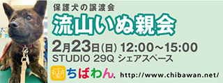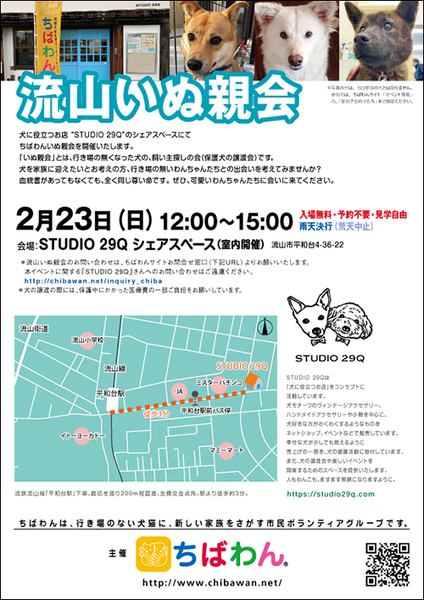 | イベント内容 | 犬に役立つお店 “STUDIO 29Q”のシェアスペースにて流山いぬ親会を開催いたします。 「いぬ親会」とは、行き場の無くなった犬の、飼い主探しの会(保護犬の譲渡会)です。 犬を家族に迎えたいとお考えの方、行き場の無いわんちゃんたちとの出会いを考えてみませんか? 血統書があってもなくても、全く同じ尊い命です。 ぜひ、可愛いわんちゃんたちに会いに来てください。 いぬ親会見学は予約等必要ありません。無料でどなたでも入場できます。 皆様のお越しをお待ちしております。 日時:2月23日(日)12:00~15:00 室内開催:雨天決行 (荒天中止) 場所:STUDIO 29Q シェアスペース 住所:流山市平和台4-36-22 【会場アクセス】 流鉄流山線「平和台駅」下車。踏切を渡り200m程直進、左側交差点角。駅より徒歩約3分。 駐車場はございません。当日お車の方は近隣のコインパーキングをご利用ください。 【注意事項】 《ご来場される皆様へのお願い》 臆病な性格の犬や、子供さんを苦手とする犬も参加しています。いきなり触ったりせず、まずボランティアに声をかけてください。 お子様と一緒にご来場される際には、手を繋ぐなどして頂き、お子様だけで参加犬に近づくことのないようご注意ください。 会場に同伴される犬には、必ずリード(引き綱)をつけてください。 【お知らせ】 ◆会場ではチャリティグッズを販売します 【お問い合せ】 いぬ親会について:http://chibawan.net/inquiry_chiba ※いぬ親会当日はメールが見れません。また、お問い合わせの際は、必ず「具体的な件名」を入れて多数の迷惑メールと区別がつくようにお願いいたします。 ※本イベントに関するSTUDIO 29Qさんへのお問い合わせはご遠慮ください。 流山いぬ親会イベントページ http://chibawan.net/event/20200223-nagareyama-dog ちばわんホームページ http://chibawan.net/ |