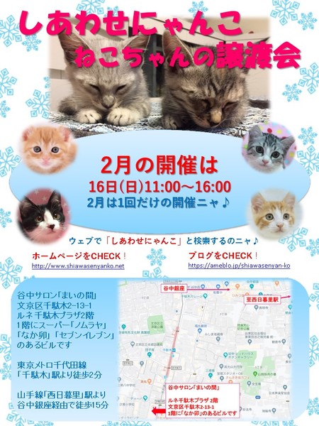 | イベント内容 | 「しあわせにゃんこ」は行き場のない猫ちゃんと里親様との出会いの場を提供するグループです♪ 子猫も成猫もハンデのある猫もみんな新しい家族を待っています♪ みなさまのご来場を保護主、スタッフ一同心よりお待ちしております♪ 2020年より猫好きの聖地「谷根千」にしあわせにゃんこがやってきます♪ 「ネコで1日楽しめる街♪」をテーマに皆様のご来場をお待ちしております。 ◆開催日/開催時間◆ 2020年2月16日(日) 11:00~16:00 ご希望の猫ちゃんがいらっしゃる場合は11時30分までに受付をお願い致します。 複数のお申し込みがある場合は11時30分で受付を終了させて頂く場合がございます。 受付をされた全ての里親様とお見合いをさせて頂きます。 ※先着順ではございません ※当日、猫ちゃんを連れて帰ることは出来ません。後日、保護主が里親様宅へお届けいたします。 ◆会場◆ 東京都文京区千駄木2-13-1 ルネ千駄木プラザ2階 谷中サロン「まいの間」 ※詳しいアクセスはHPをご覧下さい http://www.shiawasenyanko.net/jyoutokai.html 谷中サロン「まいの間」の情報はこちら http://neko-to-kyo.com/#maima ◆交通手段◆ 東京メトロ千代田線「千駄木」駅より徒歩2分 JR山手線「日暮里」駅より徒歩12分 JR山手線「西日暮里」駅より谷中銀座経由で徒歩15分 ※お車でご来場の際、駐車場のご用意はございません。 近隣のコインパーキング等をご利用ください。※近隣に沢山あります。 いつ里の掲載参加猫一覧はこちらから https://satoya-boshu.net/mypage/foster_list.php?@ps@=none アメーバブログの里親募集にゃんこはこちら https://ameblo.jp/shiawasenyan-ko/theme-10092719565.html ◆猫ちゃんとのお見合い◆ 掲載している猫ちゃんは基本的に譲渡会場でのお見合いのみとなります。 譲渡会への参加が決定している猫ちゃんはその譲渡会で里親様が決定しなかった場合のみ保護主宅でのお見合いが可能となります。 自宅お見合いを希望される里親様はメール(info@shiawasenyanko.net)にてご相談ください。 ◆当譲渡会では猫ちゃんと里親様のスキンシップを大切にしています◆ 新しい家族として20年以上いっしょに暮らしていく猫ちゃんです。 譲渡会場でたくさんの猫ちゃんと触れ合って良きパートナーを見つけてください。 はじめて猫ちゃんを迎える不安や先住猫ちゃんとのトライアルの注意点、猫ちゃんと里親様の暮らし方など気軽にご相談ください。 経験豊富な保護主や猫大好きスタッフがアドバイスさせていただきます。 ◆子猫ご希望の里親様◆ 子猫は急な下痢や発熱等により体調が急変し、数時間対応ができなかっただけでも命を落とす事があります。 その為、当譲渡会では月齢によりお留守番のない又は少ないご家庭への譲渡に限らせて頂いております。 また里親様と子猫ちゃんが安心してトライアル期間を過ごせるよう体重が1㎏程になってからのお届けとさせて頂いております。 ◆里親希望のみなさまへ◆ ご家族の皆様で生涯、家族の一員としてたっぷり愛情を注いでくださるご家庭をお待ちしております。 下記に該当する希望者様へ ・独身、単身者の方 ・友人同士、同棲でのお住まいの方 ・高齢者のみのご家庭の方 は、ご相談の上、譲渡を判断させて頂きます ・適正飼育の不可能な方 ・脱走防止対策にご協力頂けない方 ・定期報告の不可能な方 は、ご遠慮下さいますようお願い致します ◆ご負担頂く費用について◆ 譲渡の際に譲渡負担金(医療費の一部、譲渡金、お届け時の交通費)を里親様にご負担頂く事により 過酷な状況にいる猫ちゃんを保護し新しいご家族の元へ送り出す事ができています。 皆様のご理解とご協力にボランティア一同、心より感謝しております。 ご負担頂く医療費につきましてはホームページに詳しく記載させて頂いております。 http://www.shiawasenyanko.net/onegai.html しあわせにゃんこホームページ http://www.shiawasenyanko.net メールでのお問い合わせ info@shiawasenyanko.net |