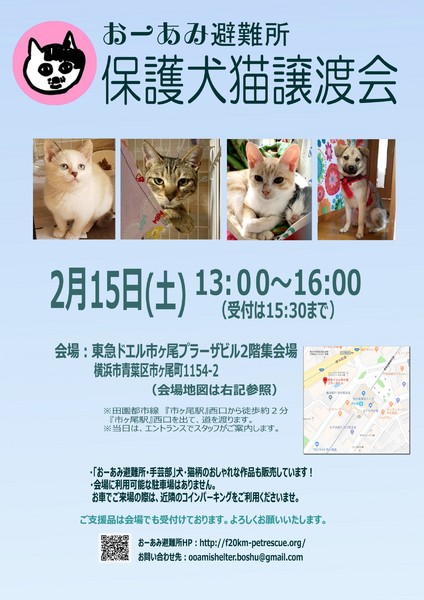 | イベント内容 | 可愛い仔犬・仔猫・成猫がたくさん、出場しますよ! 当日にはご来場できないかたも、ぜひお問い合わせください。 別日にお見合いの設定も可能です。 どうぞ、よろしくお願いします。 ☆★☆★☆★☆★☆★☆★☆★☆★☆★☆★☆★☆★☆★☆★☆★☆★☆★☆★☆ ~2月15日(土)市ヶ尾にて里親会開催!~ ◎場所・・「東急ドエル市ヶ尾プラーザビル2階集会場」 横浜市青葉区市ヶ尾町1154-2 東急田園都市線「市ヶ尾」駅より徒歩2分 ◎日程・・2月15日(土)(雨天決行) ◎時間・・13時から16時(受付は15時30分まで) (駐車場はございません。お車でお越しの際は近隣のコインパーキングをご利用ください) ■当日ご来場の方全員にアンケートを記入して頂きます。 ■下記リンクより事前にアンケートをご記入いただくと、待ち時間が短縮されます。 ★ 猫ご希望のかた向けアンケート https://goo.gl/ZNRFtI ★ 犬ご希望のかた向けアンケート https://goo.gl/pwWUMj ■アンケートで頂戴した個人情報は適切に管理し、里親さま決定のための資料としてのみ使用いたします。 ■アンケートをご提出いただいても、譲渡をお約束するものではないことをご承知置きください。 ※参加予定の猫は体調により参加できない場合があります。ご了承ください。 ※詳細はお問い合わせいただくか、ブログ・HPをご覧くださいませ。 おーあみ避難所ブログ:http://ameblo.jp/oami-hinanjyo おーあみ避難所HP:http://www.geocities.jp/oami_hinanjyo/ ☆★☆★☆★☆★☆★☆★☆★☆★☆★☆★☆★☆★☆★☆★☆★☆★☆★☆★☆ |
