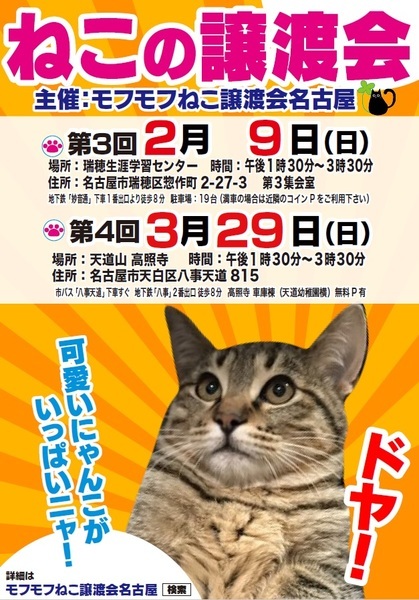| イベント内容 | 3/29譲渡会は新型コロナウイルス対策により中止となりました。 個別でのお見合い等は出来ますので、気になる猫がいましたらご連絡をお願いいたします。 問い合わせ先 mofumofuneko4☆gmail.com ☆を@に変えて送ってください。 モフモフねこ譲渡会名古屋 猫たちの幸せなお家探しのために譲渡会を開催しております。 個人ボランティアの集まりです。 自分たちの出来ることから頑張っております! 一匹でも幸せになれる猫が増えますように 場所 天道山 高照寺 車庫棟(天道幼稚園横) 住所 名古屋市天白区八事天道815 時間 13時30分~15時30分 交通機関等 市バス「八事天道」下車すぐ 地下鉄「八事」2番出口より徒歩8分 無料駐車場有 参加猫の情報は下記モフモフねこ譲渡会名古屋ブログにてご確認ください。 https://mofumofuneko4.fc2.net/ 【譲渡会について】 ・譲渡会は入場無料、予約不要です。お気軽にご参加ください。 ・会場へのお問い合わせはご遠慮ください。 ご質問は下記メールアドレスへお願いいたします。 mofumofuneko4☆gmail.com ☆を@に変更してお問い合わせください。 ・猫の引き取りはしておりません。 ・譲渡会当日に猫をお渡しすることはありません。 ・保護主によって譲渡条件が違う場合があります。 ・参加予定でも譲渡会前にトライアルになる場合があります。 ご希望の猫がいましたらまずはお問い合わせをお願いいたします。 【参加猫について】 ・ノミ駆除、駆虫、トイレ躾、ワクチン3種接種済。 ・年齢や健康状態に応じて、避妊手術を行っております。 ・参加予定で紹介していても当日体調不良等で欠席になる場合があります。 【譲渡の約束事】 ・ペット飼育可の住宅にお住まいの方。 ・完全室内飼育。 ・脱走防止の対策をしていただける方。 ・避妊手術未実施の場合、避妊手術 の実施と報告をしていただける方。 ・ご家族全員が猫を飼うことに同意していること。 ・譲渡後、しばらく定期連絡を入れていただける方。 *お一人暮らしの方、60歳以上の方は、身内の方の保証を必要となる場合がございます。 |