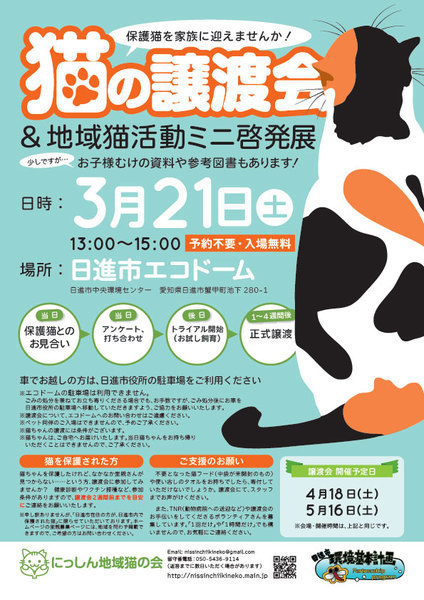 | イベント内容 | 新型コロナウイルスの感染症拡大防止のため、開催中止を決定いたしました。 http://nissinchiikineko.main.jp/2020/03/05/jotokaichushi03/ ------- 3月21日(土)に「猫の譲渡会」を開催いたします。 猫少なめのミニ譲渡会&地域猫活動啓発展です。 日進市内で保護された猫さんたちがお待ちしております。 まだ猫を飼う予定のない方も、また、地域猫活動に興味のある方、猫トラブルで相談したい方もどうぞお気軽にお立ち寄りください!(^^)/ 【日時】2020年3月21日(土)13:00〜15:00 【会場】日進市エコドーム(中央環境センター) ※ご予約不要・入場無料です。 ※ペット同伴のご入場はできませんので、予めご了承ください。 ※猫ちゃんの譲渡には条件がございます。詳細はホームページをご参照ください。 ※車でお越しの方は、日進市役所の駐車場をご利用ください(徒歩1分)。エコドームの駐車場は、ごみを持参される方専用のため、利用できません。ごみの処分を兼ねてお立ち寄りくださる場合でも、誠にお手数ですが、ごみ処分後にお車を日進市役所の駐車場へ移動していただきますよう、どうぞご協力をお願いいたします。 【主催】にっしん地域猫の会 【ホームページ】http://nissinchiikineko.main.jp |