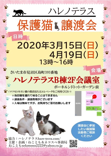 | イベント内容 | お買い物がてらに気軽に来ていただける保護猫譲渡会です 2020年3月15日【日】13時から16時 埼玉県さいたま市見沼区島町393番地 ハレノテラス B棟2F会議室 ハレノテラスHP http://hare-terra.com/ ☆入場無料(ただしお気持ちだけご寄付お願いします) ☆当日猫を連れ帰ることはできません ☆譲渡条件あります。譲渡費用発生します。 |