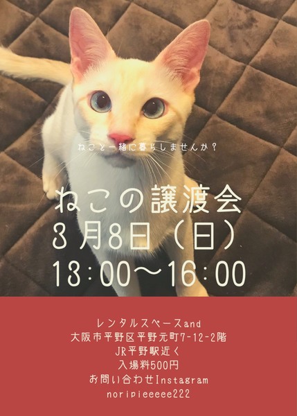 | イベント内容 | 3月8日(日)に『ねこの譲渡会』を開催します。 保護猫の里親探しをしています。 ねこを家族に迎えたいと思っていらっしゃる方ぜひご来場ください。 たくさんの方のご来場をお待ちしています。 【日時】2020年3月8日(日)13:00~16:00 【会場】レンタルスペースand(アンド) ※会場費等として入場料を大人1名様500円いただいております。ご協力お願いいたします。 ※お車でお越しの方は、当ビルに駐車場はございません。近隣のコインパーキングをご利用下さい。 ※譲渡会当日にねこを連れて帰ることはできません。後日お届けとなります。 ※保護主により譲渡条件は異なります。 問い合わせ先 萩野 noripieeeee0326@gmail.com |