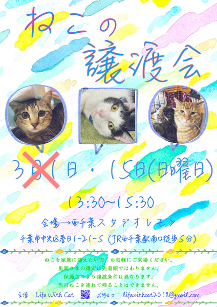 | イベント内容 | *コロナウィルス感染防止のため今回の譲渡会は中止します* ご来場を予定してくださった方 申し訳ありません。 個人ボラさんが愛情をかけて保護している大きな猫ちゃんや小さな猫ちゃんたちが ずっとのお家を求めて集まります。 ねこを家族に迎えたいとお考えの方 どうぞお気軽にご来場ください! ---お願い--- コロナウィルスなどの感染予防のため 風邪のような症状のある方は次回以降にお越しください。 また基礎疾患のある方のご来場も控えていただいた方が賢明です。 ご参加の方は マスク・手袋などの着用をお願いいたします。 ----------- *里親さまの選定は先着順ではありません。 *保護主により譲渡条件は異なります。 *当日ねこちゃんを連れて帰ることは出来ません。 後日 保護主が里親様宅へお届けいたします。 *里親様に医療費のご負担をお願いしております。 第30回 Life With Cat『ねこの譲渡会』 3月1日(日曜日) 13:30~15:30 <会場> レンタルスタジオレモン 260-0033 千葉市中央区春日1丁目21-5 (JR西千葉駅/京成西登戸駅より徒歩4分) *駐車場のご用意はございません。 スタジオより徒歩1分圏内にコインパーキングが多数ありますので そちらをご利用ください。 |