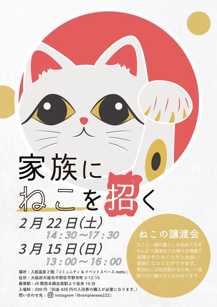 | イベント内容 | 3月15日(日)にねこの譲渡会『家族にねこを招く』を開催します。 ねこと一緒の暮らしを始めてみませんか? ねこを家族に迎えたいと思っていらっしゃる方ぜひご来場ください♪ たくさんの方のご来場をお待ちしています。 【日時】2020年3月15日(日)13:00~16:00 【会場】入船温泉2F「コミュニティ&イベントスペースmott」 ※入場料おひとり様200円いただいております。別途420円の入浴券の購入が必要になります。(入浴もお楽しみいただくことが可能です。) ※譲渡会について、会場へのお問い合わせはご遠慮下さい。 ※譲渡会当日にねこを連れて帰ることはできません。後日お届けとなります。 ※保護主により譲渡条件は異なります。 問い合わせ先 萩野 noripieeeee0326@gmail.com |