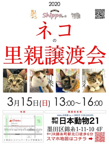 | イベント内容 | 【中止のお知らせ】 新型コロナウイルス感染症が拡大している状況を受け、各方面と協議しまして、参加者およびご来場者さまの健康・安全面を第一に考慮した結果、下記日程のの譲渡会の開催を取りやめることといたしました。 楽しみにされていた皆様には大変申し訳ございませんが、ご理解いただきますようお願いします。 2020年3月4日 平井小松川Shippoの会 今回も錦糸町の専門学校日本動物21様のご協力により、同校舎で猫の里親譲渡会を開催させていただくことになりました。 13:00スタートです! ヤンチャな子猫・おとなしい子猫・お留守番バッチリの大人猫さんたちが参加予定です。 一緒に保護した兄弟猫さん、一生懸命子育てしたママ猫さん、ハンディでも元気な猫さん等々、個性豊かな猫さんたちが準備万端で、里親さんとのご縁を待っています。 参加猫さんはこちらからご覧下さい。(随時更新) https://www.pet-home.jp/member/user360938/post/ 小さい頃から一緒に暮らしたい育てたいとお考えの方、子猫ちゃんたちも参加予定なので、ぜひお越しください! 一人暮らしの方やご高齢の方にも、ぴったりのまったりした大人猫さんたちも参加予定です。 きっと、運命の出会いがあると思います。 里親希望の皆さま、ぜひ、足をお運びください! ●日時:3月15日(日) 13:00~16:00 ●会場:専門学校 日本動物21 墨田区錦糸1-11-10 4F ●アクセス: JR総武線・総武快速線「錦糸町駅」 北口徒歩6分 東京メトロ半蔵門線「錦糸町駅」 3出口徒歩6分 ※東京都墨田区錦糸1-2-1(アルカタワーズ)は同校の法人本部です。 里親譲渡会の会場ではございませんので、お間違いのないよう御願い致します。 ●参加猫および諸条件については、下記「ペットのおうち」からご覧ください。(随時更新) https://www.pet-home.jp/member/user360938/post/ ☆譲渡には当会における一定の条件があります。 ☆当会および里親譲渡会についてのお問い合わせ ☆外猫、保護猫のために物資のご支援を頂ける方がおりましたら、送付先をご連絡させていただきますのでご連絡下さい。 ☆預かりボランティアさん、活動のお手伝いをして頂ける方も随時募集中です。 アメブロ、更新中です https://ameblo.jp/hirakomashippo/ インスタグラム、更新中です https://www.instagram.com/hirakomashippo/ |