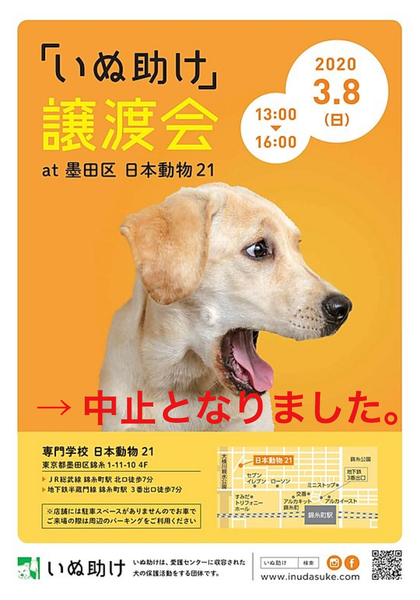 | イベント内容 | 3/8開催を予定しておりました譲渡会は、新型コロナウィルスの感染拡大を受け、参加者の健康•安全面を第一に考慮し中止することになりました。 わんことの面会を希望される方は、ホームページ里親希望アンケートにてお問い合わせ下さいますようお願いいたします。 |