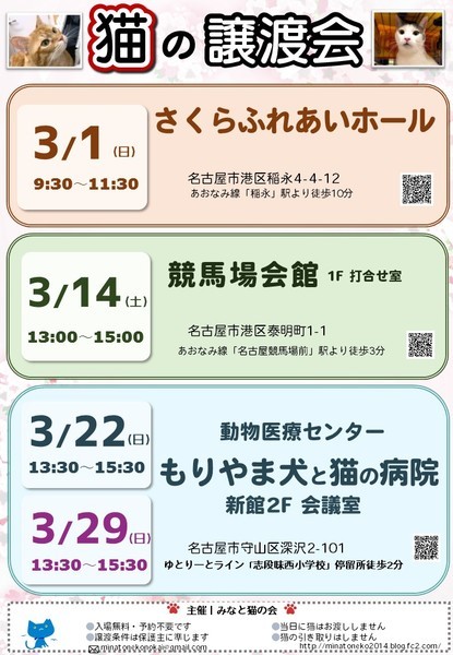 | イベント内容 | =みなと猫の会 第233回譲渡会のお知らせ== 新しい家族を待つ猫たちに 会いに来ませんか? ◆ペットショップへ行く前にぜひ譲渡会へ◆ トイレトレーニングや 基本的な健康診断を終わらせた 猫たちが大集合! ○主 催 みなと猫の会 ○日 時 3月1日(日)9:30~11:30 ○場 所 さくらふれあいホール 名古屋市港区稲永4丁目4-12 https://goo.gl/maps/KPNpFZy3x2n23FRw6 あおなみ線「稲永」駅より徒歩10分 ※車でお越しの場合は 指定無料駐車場をご利用ください ①https://goo.gl/maps/fbhVb4MCZJi5xuvg7 ②https://goo.gl/maps/bTZTBF3KCu7SGb7H7 ※消毒液設置済 ご自由にお使いください ※お問い合わせは会場ではなく minatonekonokai@gmail.comまで ○参加猫について ・参加している猫は、ワクチンや駆虫等の基本治療を済ませています。 また、年齢に応じて避妊去勢手術を行っています。 ・参加予定猫が体調不良などで急遽不参加になることもあります。 ○ご来場の皆様へ ・譲渡会の見学は入場無料・予約不要です。 ・当日に猫をお渡しすることはありません。 後日ご自宅までお届けに伺います。 ・一週間から二週間のトライアル期間後、正式譲渡となります。 ・トライアル及び譲渡の際には 完全室内飼い・ご家族の同意・脱走防止策・ アンケート記入など諸条件がございます。 ・里親様には治療費の一部ご負担をお願いしております。 これ以上不幸な猫を増やさないための 治療費とさせて頂きますので何卒ご理解ください。 ・非会員の個人保護者も参加しています。 譲渡条件やトライアルは猫の保護者に準じます。 ・譲渡会の流れ http://minatoneko2014.blog.fc2.com/blog-entry-11.html ○参加猫情報は随時更新中! ↓↓参加猫一覧↓↓ http://minatoneko2014.blog.fc2.com/blog-entry-493.html ○猫に関する相談も受け付けています ねこについての困りごと、トラブルなどを抱えている方、 相談へいらっしゃいませんか。 ○次回以降の譲渡会予定 日時:3月14日(土)13:00~15:00 場所:競馬場会館 1F 打合せ室 名古屋市港区泰明町1-1 あおなみ線「名古屋競馬場前」駅より徒歩3分 日時:3月22日(日)13:30-15:30 場所:動物医療センター もりやま犬と猫の病院 愛知県名古屋市守山区深沢2-101 ゆとりーとライン「志段味西小学校」バス停留所 徒歩2分 日時:3月29日(日)13:30-15:30 場所:動物医療センター もりやま犬と猫の病院 愛知県名古屋市守山区深沢2-101 ゆとりーとライン「志段味西小学校」バス停留所 徒歩2分 日時:4月5日(日)13:30~15:30 場所:港生涯学習センター 3階 第2集会室 名古屋市港区港陽1丁目10−18 地下鉄名港線「港区役所」駅より徒歩9分 ◎主催者ブログ みなと猫の会 ~こぴっと猫だより~ http://minatoneko2014.blog.fc2.com/ ◎参加者のブログ myままさんブログ「にゃんこの宝箱」 http://wagayamama.cocolog-nifty.com/jiru/ 犬白ママさんブログ「犬白日記」 http://k531.blog25.fc2.com/ uzumakinecoさんブログ「猫ときどき雨」 http://uzumakineco.blogspot.jp/ sion1226さんブログ「さとおやさがし」 http://sion1226.blog.fc2.com/blog-entry-1.html ■上記ブログに会ってみたい猫がいた!でも参加予定猫に入ってない、 どうすればいいの? ■譲渡会当日は都合が悪くて… それ以外の日に猫とお見合いがしたい! などのお問い合わせは minatonekonokai@gmail.com まで 写真1枚目 ちまき ♀ 2~3才 ビビリんちょですが仲良くなると超甘えっ子になります 写真2枚目 くい ♀ 9ヶ月 マイペースで人馴れ◎ 食いしん坊さんです♪ ☆★個性豊かな猫たちが皆様をお迎えします★☆ 猫とスタッフ一同、お待ちしております。 |