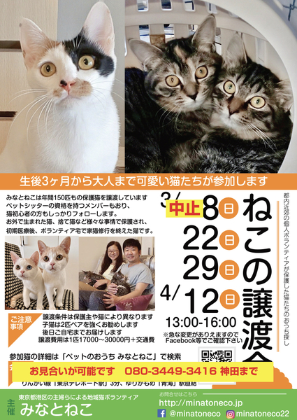| イベント内容 | 東京都港区で猫の保護や譲渡をしている主婦のメンバーが中心のボランティアグループです。 預かり宅でのお見合いとお台場ヴィーナスフォートで定期的に譲渡会を開催して毎月20匹くらいを譲渡しています。 子猫中心ですが廃業ブリーダーから引き取った大人猫や協力ボランティアさんがセンターから引き出した猫なども参加します。 小規模ですが猫と里親さんの幸せを優先に、飼育環境や猫の経験やご家族構成、お留守時間などをお聞きしてぴったりの猫をご案内します。 初めてでもしっかりとフォローします。 ■注意事項 -混み合っている場合は少し時間をずらしてお越しください。 -猫と人間の安全のためにケージ越しでの触れ合いのみとなります。 -猫それぞれの性質を鑑みて応募条件がありますので是非事前にペットのおうちをご覧ください。 -お目当ての猫がいる場合にはペットのおうちからお申し込みの上、当日お部屋の写真などお持ちください。 -コロナの感染拡大などによりやむを得ず中止となる場合があります。 |