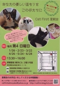| イベント内容 | 〈皆さまへのお願い〉 ※コロナウィルス感染拡大防止の為、当日はマスク着用でお越し下さい。 ※また消毒のご協力お願い致します。 ※換気の為に会場の窓、入り口ドアを開放します。 その為猫の脱走防止対策として抱っこ、ケージのドアを開けての触れ合いは 原則禁止とします。 ※状況によりましては入場制限、時間制限を設ける場合がございます。 時間に余裕を持ってお越し下さい。 皆様にはご迷惑おかけ致しますが 何卒、ご理解ご協力のほど宜しくお願い致します。 ※入場料は無料、ご予約も不要です。 ※近隣にはコインパーキングもございます。 ※東洋ビルへのお問い合わせはご遠慮願います。 ※当日、猫は連れて帰れません。 ※里親会開催までに里親様が決まったり、 体調不良等の理由で当日参加できない場合がございます。 お問合せ先 catfirstsatooyakai@yahoo.co.jp ブログ http://catfirst.blog.fc2.co |