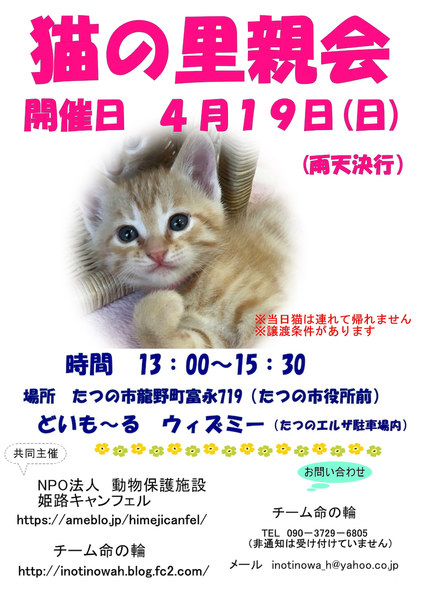 | イベント内容 | 猫の譲渡会 保護猫の里親探しをしています。 猫ちゃんを飼いたいと思っていらっしゃる方是非ご来場ください♪ 開催日時 2020年4月19日(日)室内で開催♪駐車場あり! 13:00~15:30 会場 たつの市龍野町富永719(たつの市役所前) どいもーる ウィズミー (どいエルザ動物病院駐車場内) ※譲渡は先着順ではありませんが、お早めにお越しください ※当日猫ちゃんは連れて帰れません。後日お届けとなります ※保護主により譲渡条件は異なります。 主催 NPO法人 動物保護施設 姫路キャンフェル https://ameblo.jp/himejicanfel/ & チーム命の輪 http://inotinowah.blog.fc2.com/ 問い合わせ先 チーム命の輪 090-3729-6805 (非通知は出ません) メール inotinowa_h@yahoo.co.jp |