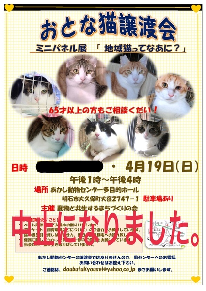 | イベント内容 | 新型コロナの影響で、4月19日は中止になりました。 場所○あかし動物センター多目的ホール 無料駐車場有 日時○4/19(日)13時〜16時 主催○動物と共生するまちづくりの会 多頭飼育現場から参加の大人猫の譲渡会です。 参加する猫はみんな、現在も、暗くてホコリっぽい農具倉庫のケージに入れられ暮らしています。 何年も狭いケージだけで暮らして来たため、怖がりな子が多いですが、これまでに里親さまに迎えられた怖がりさんも、今ではお家ですっかり甘えっこに変身していますので、気長に慣らしてくださる里親さんを募集します。 大人しい子が多く、落ち着いた大人猫ばかりです。 また、餌の世話はきちんとされており、どの子毛艶がよく健康です。 猫との優しい生活を望んでおられる方、単身の方、シルバー世代の方もご相談ください。 参加猫の里親さん募集記事も載せています。 ぜひご覧になって下さい。 |