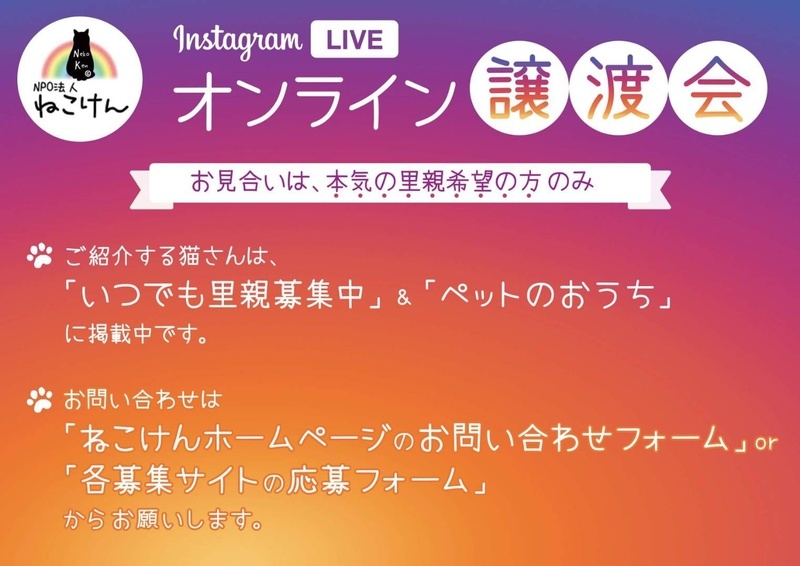 | イベント内容 | ねこけんオンライン譲渡会★インスタLIVE配信! 今回は記念すべき"第1回"開催です! ねこけんのInstagramアカウントより配信 @nekoken2222 シェルターや預かりさん宅よりリアルタイムで猫さんのご紹介をいたします♪ 譲渡会では緊張してしまったりして固まってしまう子も多いですが、普段通りの可愛い様子が見られちゃう!?!? たくさんのご参加お待ちしております! 個別お見合いのセッティングが可能な場合がございます。ご希望の猫さんがいる場合、メールもしくは問い合わせフォーム、各種里親募集サイトよりお問い合わせください。 [お問い合わせ] メールアドレス nekoken@cat.email.ne.jp ねこけんHPお問い合わせフォーム https://nekoken.jp/inquiry/ いつでも里親募集中 https://satoya-boshu.net/foster/?@button_name@=search&FosterParent_MemberID=1288&StatusID=2 ペットのおうち https://www.pet-home.jp/member/user37641/post/status_2/ 今後も土日祝日に開催したいと思っております。 決定次第お知らせをいたします! -------------------- ペットとしてではなく、生涯家族として猫を迎えて下さる方への譲渡となります。 ◆必ずお守り頂く事◆ ①終生飼養 ②完全室内飼養 ③年1回のご報告 ④ペット飼育可能な物件にお住まいであること 不妊去勢手術・医療費の一部負担をお願いしております。 ※お届けエリアによっては掲載の譲渡費用とは別途、往復高速料金(実費)をご負担いただく場合がございます。 ご希望の猫さんと家族になるまでの流れや、譲渡時にかかる一部ご負担金などの詳細、契約書のサンプルも含め下記URLに掲載しております。ご確認ください。 http://nekoken.jp/jotokai/joto-nagare/ https://nekoken.jp/jotokai/joutokibou/ なお、譲渡対象エリアは東京近郊(東京都・神奈川県・埼玉県・千葉県)に限らせていただきます。 対象エリア内であっても、遠方の場合アフターフォローの関係上お断りさせていただく場合もございますのでご了承ください。 |