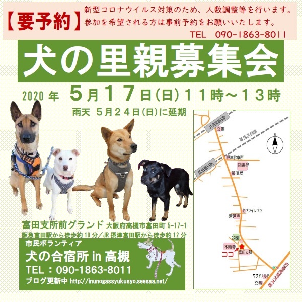| イベント内容 | ※コロナウイルス対策のため、完全予約制とさせていただきます。 ※屋外会場です。 雨天時は5/24(日)に延期します。 ※お見合い希望の話があったワンちゃんだけが参加します。 ブログで保護犬情報を紹介しています。 【予約・問合せ】 090-1863-8011 ・・・・・・・・・・ 【アクセス】 ・阪急京都線 富田駅から徒歩約10分 ・JR京都線 摂津富田駅から徒歩約12分 ※隣接する富田支所と公民館の駐車場は使えません。 ・・・・・・・・・・ 市民ボランティア「犬の合宿所in高槻」は、殺処分数の多い地方の保健所収容犬を引き取り、関西で新しい飼い主探しをしています。 保護犬を飼うことが文化として定着することで生体販売に伴う悲惨な繁殖犬の存在がなくなることと、 地方の収容犬を人口の多い地域で引き受けることで全体として処分数が減ることを目指しています。 ・・・・・・・・・・・・・・・・・・・・・・・・・・・・・ ★ 一時預かりさんや犬の搬送ボランティアさん、里親募集会のお手伝いの方を、常時募集しています。 ★犬によっては個別お見合いできる場合があります。 里親募集会に参加できない方で個別お見合いをご希望の方は、預かりさんとの日程調整が必要ですので、電話でお問合せください。⇒090-1863-8011 ★参加犬等の最新情報はブログで発信しています。是非チェックしていてください⇒ http://inunogassyukusyo.seesaa.net/ |