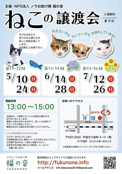| イベント内容 | 保護された猫たちが、新しい家族を探しに参加をします。 幸せになるために猫の家族を迎えたい方は、ぜひお越しください! ただし、ペット不可にお住まいの方はご遠慮ください。 当日猫を連れ帰ることは出来ません。 後日こちらから、猫を連れて伺わせて頂きます。 近所にはコインパーキングがあり、JR芦屋駅から徒歩5分ほどです。 最近の情勢を鑑み、譲渡会に来られる場合は、事前にメールでのお問い合わせに連絡をして頂き、 【 当日までに予約を取ってから 】お越しくださいませ。 お問い合わせのアドレスは miina0807@y5.dion.ne.jp お手数をおかけしますが、よろしくお願いいたします。 |