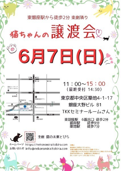 | イベント内容 | ※ご来場頂く方と私たち保護主、スタッフの安心と安全の為、感染リスクを限りなく低減させる為、私たちが出来うる対策をしてお待ちしております※ 【ご来場いただく皆様には下記についてお願い致します】 ★マスクの着用をお願い致します。 (マスク着用のない方は入場出来ません) ★譲渡会場にお入り頂く前に手洗いと手の消毒をお願い致します。 ★ソーシャル・ディスタンス(人と人との間隔を開ける)をお願い致します。 ★熱のある方や体調の優れない方は譲渡会への来場を見合わせて頂けますよう、お願い致します。 ★来場者数によりましては人数制限もありますのでお待たせてする場合もございます。 予めご了承下さい。 ★今回、仔猫ちゃんは兄妹、姉妹での譲渡となりまので、1頭ご希望の方は又の機会にお越し頂きたく、お願い致します。 なお、見学だけの方は蜜を避ける為に来場をお断りさせて頂きます。 コロナウイルス感染拡大防止の為、このような厳しいお願いで大変恐縮ですが何卒ご理解とご協力、ご了承をいただけますようお願い致します。 ★☆★★☆★★☆★★☆★★☆★★☆★★☆★★☆★★☆★ 東銀座で保護猫の譲渡会を開催しています「猫の未来とびら」です♪ 恵まれない環境にいる猫たちが未来へのとびらを開いて幸せなご縁に繋がる橋渡しをしていきます。 たくさんの猫ちゃんと保護主・スタッフ一同みなさまのご来場を心よりお待ちしています! 子猫ちゃん〜成猫ちゃんまで参加します♪ ★開催日時 2020年6月7日(日) 11:00~15:00 (最終受付 14:30) ★会場 東京都中央区築地4-1-17 銀座大野ビル B1 TKKセミナールームさんにて (東劇となり) ★最寄駅 東銀座駅 6番出口 徒歩2分 銀座駅 徒歩9分 ・築地駅 徒歩7分 駐車場のご用意はございませんので近隣のコインパーキング等をご利用ください。 会場への直接のお問い合わせはご遠慮くださいませ。 ★☆★★☆★★☆★★☆★★☆★★☆★★☆★★☆★★☆★ 会場で猫ちゃんと触れ合ってご縁を繋いでください。 里親様・猫ちゃんが双方、幸せな家族になれるよう保護主・スタッフがサポート致します。 ご不安な事はお気軽にご相談ください。 入場無料です。事前のご予約は必要ございません。 ご希望の猫ちゃんがいらっしゃる里親希望者様は11時~11時30分までに会場へお越しください。 11時30分までに受付されたすべての里親希望者様と保護主がお話をさせて頂き 1匹に複数のお申込み、里親様と猫ちゃんに合うご家庭がございましたら 受付を終了する場合もございます。 里親様が決まっていない猫ちゃんに関しましては随時保護主とご相談ください。 当日猫ちゃんの引き渡しはございません。 後日、保護主が里親様宅へお届けいたします。 ※参加予定猫ちゃんは、急な体調不良等で不参加になる場合もございます。 開催当日の朝、当会ブログにて不参加の最新情報を掲載致しますのでご確認をお願い申し上げます。 ◇譲渡に関してのお願い・基本条件 1.家族の一員として終生最期まで愛育下さい。 2.完全室内飼い・ペット可のお住まい 3.脱走防止対策 4.避妊・去勢手術 5.里親様のご自宅へのお届け 6.譲渡誓約書への署名捺印・身分証明書の提示 7.医療費譲渡金のご負担 8.定期報告 9.トライアル期間有り ※保護主により譲渡条件は異なりますので会場で直接ご相談ください。 60才以上の方のみのご家庭、未成年の方、単身の方、同棲中の方、 必要な脱走対策を施していただけない方は譲渡が難しい場合もございますのでご了承ください。 小さな子猫の譲渡は体重が1kgになってからのお届けやお留守番の無い(少ない)ご家庭を希望いたします。 医療費譲渡金に関しましては詳しくはホームページの 【譲渡に関してのお願い】【譲渡の流れ】をご覧くださいませ。 ~主催 猫の未来とびら~ |