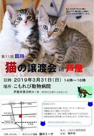 | イベント内容 | こもれび動物病院さんのご協力を頂いて、4回目の猫の譲渡会の開催いたします。 多頭崩壊やTNRで保護された猫が参加をいたします。 みんな幸せになるために参加しますので、新しい家族を見つけに来てくださいね。 ただし、ペット不可にお住まいの方はご遠慮いただいております。 猫は20歳まで生きますので、最後まで責任を持って育ててくださる方など、条件があります。 こちらではお試し期間を設けていますので、猫はこちらから後日ご自宅までお届けさせて頂きます。 その後は、家族との相性や先住猫や犬などの相性を見てから、正式譲渡になります。 |