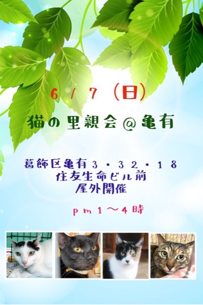 | イベント内容 | 新型ウイルス予防の為、手の消毒とマスクの着用をしております。 見学中は人と一定の距離を保つようお願いします。 マスクをしていない方の見学をお断り致します。 猫に触れない様お願い致します。 猫の里親会@亀有 6月7日 猫の里親会@亀有ちびにゃんず 日曜日午後1時~4時 屋外開催の為雨天は中止 東京都葛飾区亀有3-21-12 カルチャースペースあい (屋内開催) ご質問大歓迎です。 分からない事などなんでも聞いて下さい。 ご家族の皆様で生涯、家族の一員としてたっぷり愛情を注いでくださるご家庭をお待ちしております。 ご希望に添えない場合もございますのでご了承下さい。 【以下の方には譲渡しておりません】 ・猫の飼育が許可されていない住居にお住まいの方 ・未成年者、友人同士&同棲でお住まいの方、乳児のいるご家庭 ・単身者、高齢者のみのご家庭の方 ・脱走防止対策にご協力頂けない方 ・経済的に不安定な方(休職中、就職活動中、アルバイト等) ・仔猫の場合は留守番多いご家庭 ・住居の構造を聞かせていただく事があります。(階下への騒音など) 【当里親会は猫さんと里親様とのマッチングを大切にしています】 はじめて猫さんをお迎えする場合に適した猫さん、お留守番の長い里親さんに適した猫さん等、 お迎えする不安など経験豊富なスタッフがお話を聞き、アドバイスさせていただいています。 お気軽にお声をかけてください。 【ご負担頂く費用について】 譲渡の際に譲渡負担金(医療費の一部、譲渡金、お届け時の交通費)を里親様にご負担頂く事により 飼い主のいない猫の継続的治療や保護、新しいご家族の元へ送り出す事ができます。 ご理解とご協力をお願い致します。 ◆ご負担頂く医療費につきましては個々の猫(子猫、成猫、♂、♀)によって異なります◆ ★仔猫10.000~15.000 (ワクチン・ウイルスチェック・駆虫) ★成猫18.000~20.000 (ワクチンウイルスチェック・駆虫・不妊去勢手術済) ★猫をお届けする時の交通費をいただいております。 1500〜実費 【譲渡の条件がございます】 ①終生飼育 ②完全室内飼育 ③不妊・去勢手術 ④譲渡負担金 ⑤契約書の署名捺印 ⑥定期報告義務をご了承ください。 トライアル期間は全ての猫さんに設けております。 トライアル期間を経て初めて正式譲渡となります /////////////////////////////////////// https://twitter.com/shosukereiko 【里親さん募集中の猫~猫の里親をさがす会別館】 http://behappynyans.blog.fc2.com/blog-entry-13.html 【猫の里親をさがす会】 https://blog.goo.ne.jp/bobton |