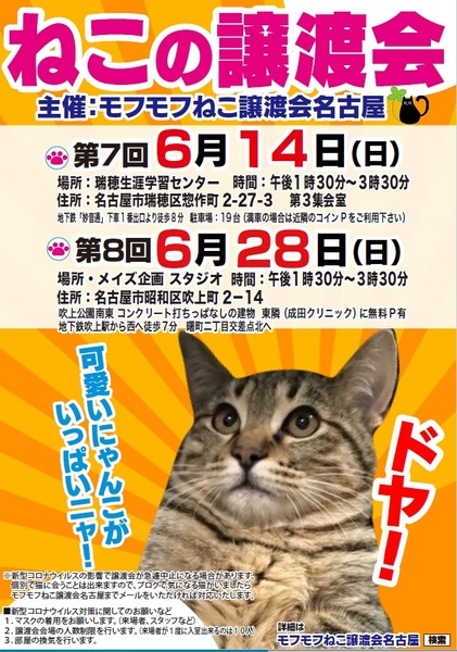 | イベント内容 | モフモフねこ譲渡会名古屋 猫たちの幸せなお家探しのために譲渡会を開催しております。 個人ボランティアの集まりです。 自分たちの出来ることから頑張っております! 一匹でも幸せになれる猫が増えますように 場所 メイズ企画 スタジオ(吹上公園南東 コンクリート打ちっぱなしの建物) 住所 愛知県名古屋市昭和区吹上町2-14 時間 13時30分~15時30分 ☆名古屋市昭和区吹上町の吹上公園近くで里親会を行います お車は、メイズ企画建物東に隣接した成田クリニックの駐車場をご利用ください。 当日限定で借りています。 地下鉄・吹上駅から徒歩5~7分です。予約不要。 参加猫の情報は下記モフモフねこ譲渡会名古屋ブログにてご確認ください。 https://mofumofuneko4.fc2.net/ 新型コロナウイルス対策として ・会場は換気を定期的に行います。 ・密を避けるため、入場制限をさせていただくことがございます。 ・入口にて手指の消毒、検温をお願いいたします。 ・ご来場の際はマスク着用をお願いいたします。 ・咳・発熱・倦怠感等の体調のすぐれない方はご来場を控えていただきますよう、お願いいたします。 【譲渡会について】 ・譲渡会は入場無料、予約不要です。お気軽にご参加ください。 ・会場へのお問い合わせはご遠慮ください。 ご質問は下記メールアドレスへお願いいたします。 mofumofuneko4☆gmail.com ☆を@に変更してお問い合わせください。 ・猫の引き取りはしておりません。 ・譲渡会当日に猫をお渡しすることはありません。 ・保護主によって譲渡条件が違う場合があります。 ・参加予定でも譲渡会前にトライアルになる場合があります。 ご希望の猫がいましたらまずはお問い合わせをお願いいたします。 【参加猫について】 ・ノミ駆除、駆虫、トイレ躾、ワクチン3種接種済。 ・年齢や健康状態に応じて、避妊手術を行っております。 ・参加予定で紹介していても当日体調不良等で欠席になる場合があります。 【譲渡の約束事】 ・ペット飼育可の住宅にお住まいの方。 ・完全室内飼育。 ・脱走防止の対策をしていただける方。 ・避妊手術未実施の場合、避妊手術 の実施と報告をしていただける方。 ・ご家族全員が猫を飼うことに同意していること。 ・譲渡後、しばらく定期連絡を入れていただける方。 *お一人暮らしの方、60歳以上の方は、身内の方の保証を必要となる場合がございます。 |