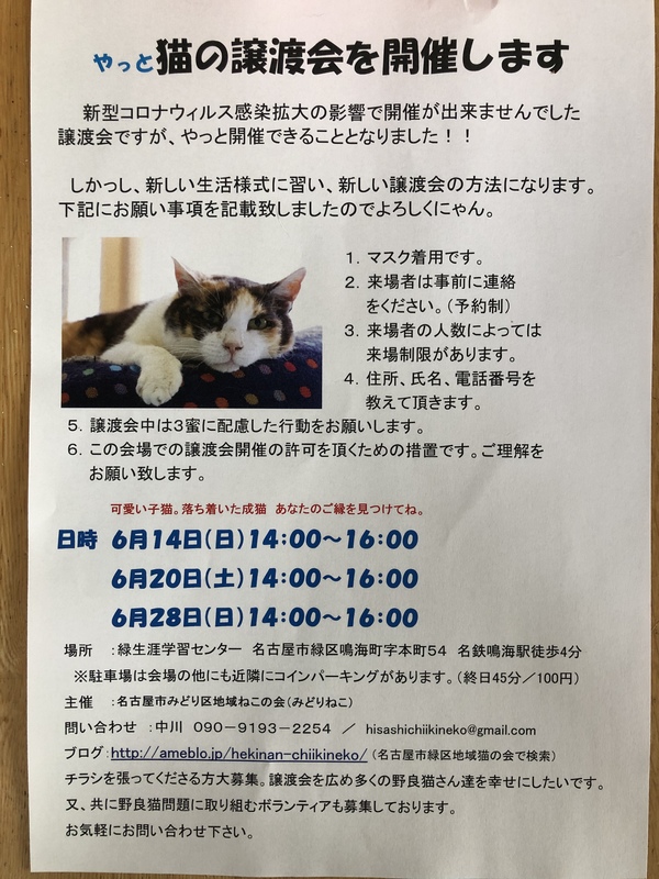 | イベント内容 | 名古屋市緑区生涯学習センターにて開催致します。新型コロナ感染拡大防止の為、予約制となります。詳細は添付のチラシにてご確認ください。 また、6月は20日土曜日、28日日曜日も開催致します。 |