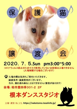 | イベント内容 | 〒277-0863 千葉県柏市豊四季301-2 2階 根本ダンススタジオ ハレノテラスHP http://hare-terra.com/ ☆入場無料(ただしお気持ちだけご寄付お願いします) ☆当日猫を連れ帰ることはできません ☆譲渡条件あります。譲渡費用発生します。 ☆マスク着用必須(マスクのないお客様は入場できません) ☆少人数でお出かけください。(入場制限する場合がございます) ☆当日 猫を抱っこすることはできません(スタッフが抱っこした猫に触れる程度) ☆新型コロナウィルスの関係で急遽中止になる場合がございます。 その場合はHPまたはSNSに掲載しますので必ずご確認の上 お出かけください ☆開催する場合も マスクは必須でお願いします。 ☆ ねことも https://nekotomo.localinfo.jp/ |