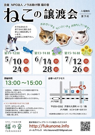| イベント内容 | 保護され子猫たちが、新しい家族を探しに参加をします。 幸せになるために猫の家族を迎えたい方は、ぜひお越しください! ただし、ペット不可にお住まいの方はご遠慮ください。 当日猫を連れ帰ることは出来ません。 後日こちらから、猫を連れて伺わせて頂きます。 近所にはコインパーキングがあります。 JR芦屋駅からは徒歩3分です。 |