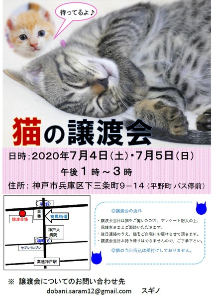 | イベント内容 | 保護された猫たちが、新しい家族を探しに参加をします。 幸せになるために猫の家族を迎えたい方は、ぜひお越しください! ただし、ペット不可にお住まいの方はご遠慮ください。 当日猫を連れ帰ることは出来ません。 後日こちらから、猫を連れて伺わせて頂きます。 近所にはコインパーキングがあり、平野のバス停の前になります。 |