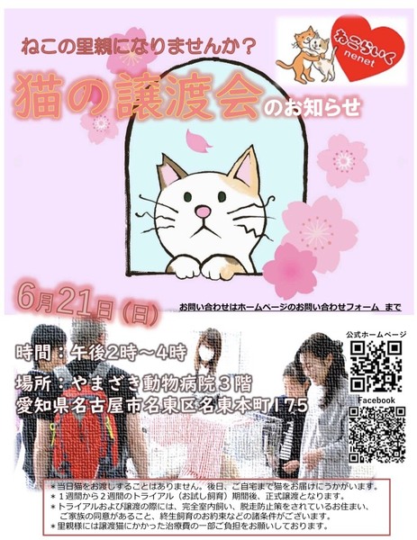 | イベント内容 | ?譲渡会のご案内? 保護猫の里親になりませんか? 〇保護猫は保護したあと、一定期間、体の状態を観察し、 トイレのしつけや基本的な健康診断を済ませています 〇それぞれの猫の特長や習慣、飼育をしていく上で 気を付けていただくことなどを現在の保護主より 説明をさせていただきます 主催:ねこらいくnenet 日にち:6月21日 (日曜日) 時間 :午後2時~4時 会場 :やまざき動物病院 3階 愛知県名古屋市名東区名東本町175番 やまざき動物病院ホームページ https://yamazaki-vet.com/ *エレベーターで直接、3階にお上がりください *駐車場は地下に5台分あります *満車の場合は近隣にコインパーキングがあります *地下鉄東山線 星ヶ丘駅 4番出口 徒歩5分 参加猫はホームページ/募集猫たちで紹介しています https://nekolike.amebaownd.com/ (参加予定猫が体調不良などで急遽不参加になることもあります) ・譲渡会の見学は入場無料・予約不要です ・当日に猫をお渡しすることはありません 後日、ご自宅までお届けに伺います ・1週間から2週間のトライアル期間後、正式譲渡となります ・完全室内飼い・ご家族全員の同意・治療費の一部ご負担などお願い事項があります 詳しくはホームページ/譲渡についてをご覧ください https://nekonetwork.com/2020/03/31/03/58/35/2671/譲渡について/ *感染症の拡大防止のためご協力をお願いいたします 〇会場は窓を開放し、常に換気をしています 〇マスクの装着をお願いいたします 〇入り口には消毒薬を用意しています 〇会場内への入室は一定の人数とさせていただきます |