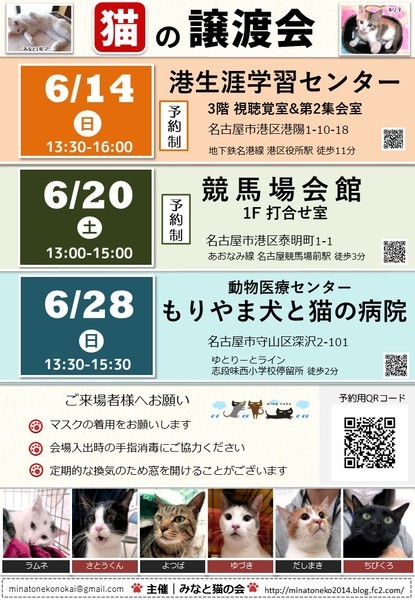 | イベント内容 | ※予約制につき、ご来場希望の方は ↓より予約をお願いいたします https://select-type.com/rsv/?id=FsEE1-K8ka0 =みなと猫の会 第238回譲渡会のお知らせ== 新しい家族を待つ猫たちに 会いに来ませんか? ◆ペットショップへ行く前にぜひ譲渡会へ◆ トイレトレーニングや 基本的な健康診断を終わらせた 猫たちが大集合! ○主 催 みなと猫の会 ○日 時 6月20日(土)13:00~15:00 ○場 所 名古屋競馬場会館 1F 打合せ室 愛知県名古屋市港区泰明町1-1 あおなみ線「名古屋競馬場前」駅より徒歩3分 ※大型無料駐車場有 https://goo.gl/maps/rCtj7cmRKTL2 ○参加猫について ・参加している猫は、ワクチンや駆虫等の基本治療を済ませています。 また、年齢に応じて避妊去勢手術を行っています。 ・参加予定猫が体調不良などで急遽不参加になることもあります。 ○ご来場の皆様へ ・譲渡会の見学は入場無料・予約不要です。 ・当日に猫をお渡しすることはありません。 後日ご自宅までお届けに伺います。 ・一週間から二週間のトライアル期間後、正式譲渡となります。 ・トライアル及び譲渡の際には 完全室内飼い・ご家族の同意・脱走防止策・ アンケート記入など諸条件がございます。 ・里親様には治療費の一部ご負担をお願いしております。 これ以上不幸な猫を増やさないための 治療費とさせて頂きますので何卒ご理解ください。 ・非会員の個人保護者も参加しています。 譲渡条件やトライアルは猫の保護者に準じます。 ・譲渡会の流れ http://minatoneko2014.blog.fc2.com/blog-entry-11.html ○参加猫情報は随時更新中! ↓↓参加猫一覧↓↓ http://minatoneko2014.blog.fc2.com/blog-entry-493.html ○猫に関する相談も受け付けています ねこについての困りごと、トラブルなどを抱えている方、 相談へいらっしゃいませんか。 〇感染症の拡大防止にご協力願います ※会場入出時の手の消毒にご協力ください ※定期的に換気作業を行います ※マスク等の装着を推奨しております ※猫とふれあった後は手を洗ってご帰宅願います 〇来場ご希望の方は↓より予約をお申し込みください https://select-type.com/rsv/?id=FsEE1-K8ka0 ○次回以降の譲渡会予定 日時:6月28日(日)13:30-15:30 場所:動物医療センター もりやま犬と猫の病院 愛知県名古屋市守山区深沢2-101 ゆとりーとライン「志段味西小学校」バス停留所 徒歩2分 ○主催者ブログ みなと猫の会 ~こぴっと猫だより~ http://minatoneko2014.blog.fc2.com/ ■上記ブログに会ってみたい猫がいた!でも参加予定猫に入ってない、 どうすればいいの? ■譲渡会当日は都合が悪くて… それ以外の日に猫とお見合いがしたい! などのお問い合わせは minatonekonokai@gmail.com まで 写真3枚目 モモ ♀ 2ヶ月 人懐こく元気いっぱい 他の猫たちと遊ぶのが大好き ☆★個性豊かな猫たちが皆様をお迎えします★☆ 猫とスタッフ一同、お待ちしております。 |