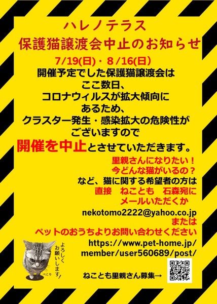 | イベント内容 | /19(日) 8/16(日)開催予定をしておりました ハレノテラス保護猫譲渡会は ここ数日、感染者数増加傾向にあるため 開催を中止にさせていただきます。 1日も早く コロナウィルスの収束を願い 9月に開催できることを祈っています。 なお 猫のお問い合わせは https://nekotomo.localinfo.jp/ 掲載しております。 よろしくお願いいたします。 |
