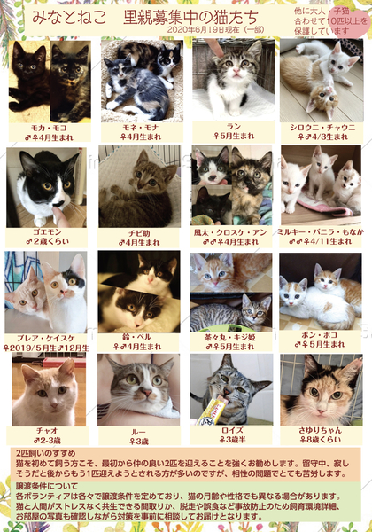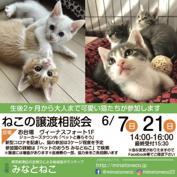 | イベント内容 | ペットのおうちで年間200匹以上の譲渡を行なっている、みなとねこがお台場で譲渡相談会を開催します。 できれば預かり宅で普段の元気いっぱいな姿をみていただきたい。けれど、ご希望の方全員にお越しいただくのは難しい。 里親希望の方にしても一度見てから考えたい、わざわざお見合いに行ってしまうと断りづらいんじゃないかというお気持ちもあると思います。 そこで毎月譲渡会を行なってきました。 今回は緊急事態宣言解除後2回目の譲渡会です。 混乱を避けるため、参加子猫は10匹程度、大人も1匹、最大5ケージ の超小規模開催です。 みなとねこは今後たくさんの子猫の保護の予定があります。また子猫をお迎えいただくにはそれなりにご準備も必要ですので、相談会という形を取り、今すぐは難しい方にもご希望の猫の条件をお伺いして、該当の猫が出てきたらご紹介という形で今まで以上にスピーディーでかつミスマッチのない譲渡を推進していきたいと思います。 また現在は生後2ヵ月ほどの子猫が中心ですので お留守が長い共働き家庭や小さなお子さんがいるご家庭ですと譲渡はより安心してお渡し出来る方に決まってしまい断られがちです。けれど夏にかけては募集する子猫も増えますのでどうかご準備の上お待ち下さい。 ただしみなとねこは子猫は2匹ペアでの譲渡が原則です。 初めての方こそ最初から2匹をお勧めしています。 また新型コロナの状況によっては直前で開催中止またはさらなる規模縮小の可能性があることご理解ください。 実際の参加予定猫は6/20(土)20:00までにFacebookページでご紹介します。 https://m.facebook.com/minatoneco/ |