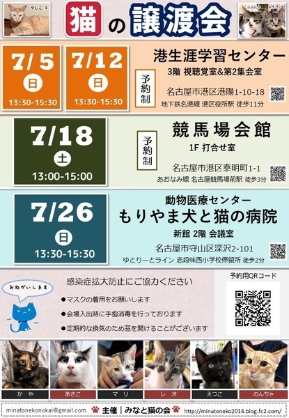 | イベント内容 | =みなと猫の会 第241回譲渡会のお知らせ== 新しい家族を待つ猫たちに 会いに来ませんか? ◆ペットショップへ行く前にぜひ譲渡会へ◆ トイレトレーニングや 基本的な健康診断を終わらせた 猫たちが大集合! ○主 催 みなと猫の会 ○日 時 7月18日(土)13:00~15:00 ○場 所 名古屋競馬場会館 1F 打合せ室 愛知県名古屋市港区泰明町1-1 あおなみ線「名古屋競馬場前」駅より徒歩3分 ※大型無料駐車場有 https://goo.gl/maps/rCtj7cmRKTL2 ○参加猫について ・参加している猫は、ワクチンや駆虫等の基本治療を済ませています。 また、年齢に応じて避妊去勢手術を行っています。 ・参加予定猫が体調不良などで急遽不参加になることもあります。 ○ご来場の皆様へ ・譲渡会の見学は入場無料 ・当日に猫をお渡しすることはありません。 ・チラシには予約制とありますが予約無しでもお越しいただけます。 ・猫は後日ご自宅までお届けに伺います。 ・一週間から二週間のトライアル期間後、正式譲渡となります。 ・トライアル及び譲渡の際には 完全室内飼い・ご家族の同意・脱走防止策・ アンケート記入など諸条件がございます。 ・里親様には治療費の一部ご負担をお願いしております。 これ以上不幸な猫を増やさないための 治療費とさせて頂きますので何卒ご理解ください。 ・非会員の個人保護者も参加しています。 譲渡条件やトライアルは猫の保護者に準じます。 ・譲渡会の流れ http://minatoneko2014.blog.fc2.com/blog-entry-11.html ○参加猫情報は随時更新中! ↓↓参加猫一覧↓↓ http://minatoneko2014.blog.fc2.com/blog-entry-493.html ○猫に関する相談も受け付けています ねこについての困りごと、トラブルなどを抱えている方、 相談へいらっしゃいませんか。 〇感染症の拡大防止にご協力願います ※会場入出時の手の消毒にご協力ください ※定期的に換気作業を行います ※マスク等の装着を推奨しております ※猫とふれあった後は手を洗ってご帰宅願います ○次回以降の譲渡会予定 日時:7月26日(日)13:30-15:30 場所:動物医療センター もりやま犬と猫の病院 愛知県名古屋市守山区深沢2-101 ゆとりーとライン「志段味西小学校」バス停留所 徒歩2分 日時:8月2日(日)13:30-15:30 場所:港生涯学習センター 3階 視聴覚室&第2集会室 名古屋市港区港陽1丁目10−18 地下鉄名港線「港区役所」駅より徒歩9分 ○主催者ブログ みなと猫の会 ~こぴっと猫だより~ http://minatoneko2014.blog.fc2.com/ ■上記ブログに会ってみたい猫がいた!でも参加予定猫に入ってない、 どうすればいいの? ■譲渡会当日は都合が悪くて… それ以外の日に猫とお見合いがしたい! などのお問い合わせは minatonekonokai@gmail.com まで 写真1枚目 レオ ♂ 3ヵ月 スリゴロで超フレンドリー 猫見知りや人見知りがありません 食いしん坊のやんちゃっ子 ☆★個性豊かな猫たちが皆様をお迎えします★☆ 猫とスタッフ一同、お待ちしております。 |