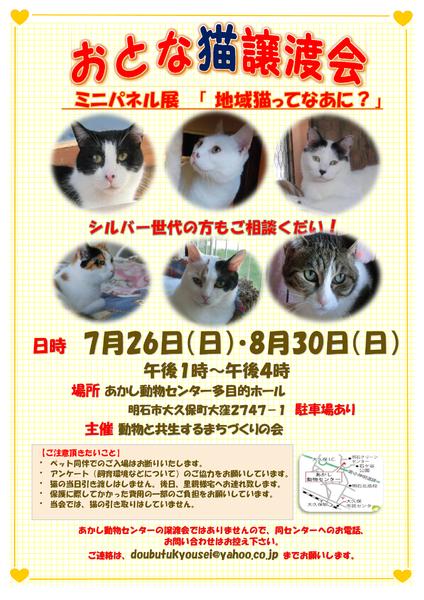 | イベント内容 | ★★★猫を家族に迎えたい方へ★★ おとな猫はなつかないと思っている方、それは間違いですよ。おとな猫も必ず飼い主になつきます。 2019年6月からある多頭飼育の家の猫の譲渡会を始めました。猫たちは、吹きさらしの農具倉庫に並べられた狭いケージに閉じ込められたまま、あるいは、狭い室内に多数の猫が暮らさざるを得ない状況で、ごはんの時間だけを楽しみに、何年も生きてきました。新しい飼い主を探すこと以外に今の状況から救ってやることができません。 譲渡会での猫は、緊張し、見知らぬ人が怖くて身を固くしますが、本当は愛情を求めています。どの子も健康状態はよく、避妊去勢手術、ウイルス検査、ワクチンを済ませています。先に新しい飼い主さんが決まった猫たちは、すっかり家族の一員となり、可愛い表情を見せています。 猫を飼うことが初めての方でも、先住猫のいるお家でも、大型ケージをお貸しし、私たちボランティアがしっかりとサポートをしますのでご安心ください。よい出会いになりますように・・・・。 ★★★「地域猫ってなあに?」ミニパネル展★★ あなたの地域では、猫の糞や鳴き声に困っていませんか。捨てられたり迷ったりした猫が増え、餌を与える人と糞害に悩む人の間に「対立」が生まれ町内がギクシャクする困りごとが、日本全国で起きています。 これを解決するのが、猫の避妊去勢手術と餌やトイレの管理を行って自然に猫を減らす「地域猫活動」です。お子様が「命の重さ」を自然と学ぶことができる取組です。 明石市には「飼い主のいない猫の避妊去勢手術」に対し「助成金制度」があります。自治会で「地域猫活動」に取組んでおられるところも多数あり、「子猫が生まれなくなった」「猫が減ってきた」など喜びの声が聞けるようになりました。「助成金制度」については「あかし動物センター」にお尋ねください。 ★★★「多頭飼育崩壊」をご存知ですか?★★ 適正に世話ができる数をはるかに超えて犬猫を飼育し、臭いや鳴き声等の近隣への迷惑により、退居を迫られるなどして、犬猫が取り残される「社会問題」です。犬猫はたいてい悲惨な状況で飼われており「虐待罪」に相当する可能性もあります。 これをふせぐ方法はただひとつ!! 1匹目を飼った時に「避妊去勢手術」をすることです。 もし、周りに気になる方がいらっしゃる場合、「避妊去勢手術していますか」と声をかけ、あかし動物センターに相談してみましょう。私たちも避妊去勢手術に協力しています。 動物と共生するまちづくりの会 https://www.facebook.com/akasidoubutu/ |
