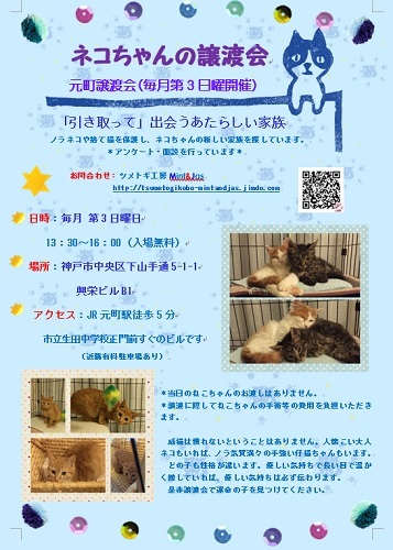 | イベント内容 | 毎月第3日曜日、神戸元町でネコちゃん譲渡会を開催しています。 日時:平成31年2月17日(日)13:30~16:00 入場無料、予約不要です 場所:神戸市中央区下山手通5-1-1興栄ビルB1F 神戸市立生田中学校正門前すぐのビルです アクセス:JR元町駅徒歩約2分 駅山手側 お問合せ:HP内お問合せフォームよりお願いいたします。 https://tsumetogikobo-mintandjas.jimdo.com/ |
