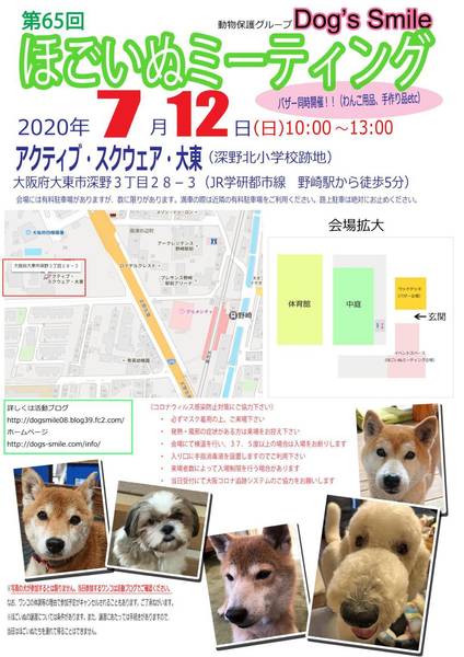 | イベント内容 | 7月12日(日曜日)、大阪府大東市内にて「第65回ほごいぬミーティング」を開催します。 保護犬を家族に迎えようと考えている方、保護犬に会ってみたい方、保護犬について知りたい方、ぜひご来場ください。 当日は、Dog's smileグッズやワンコ用品の販売、Dog's smileを応援してくださる方々が手作りされた手作り雑貨などの販売も行います。どれもお買い得です。 売り上げは、私たちの活動資金になります。ぜひご協力をお願いします。 なお、来場予定のワンコについては、活動ブログをご確認ください。 コロナウイルス感染防止対策に御協力下さい。 ・必ずマスクを着用の上、ご来場下さい。 ・発熱・風邪の症状がある方は来場をお控え願います。 ・会場入口にて検温を行い、37.5度以上の場合は入場をお断りします。 ・入口に手指消毒液を設置しますので、ご利用下さい。 ・来場者数により、入場制限を行う場合があります。 ・当日受付にて「大阪コロナ追跡システム」へのご協力をお願いします。 日時 令和2年7月12日(日)午前10時~午後1時 場所 「アクティブ・スクエア・大東」イベントスペース 大阪府大東市深野3丁目28-3 (JR学研都市線野崎駅から西に徒歩3分) 会場には有料駐車場がありますが、数に限りがあります。満車の場合には、近隣のコインパーキングの御利用をお願いします。 |