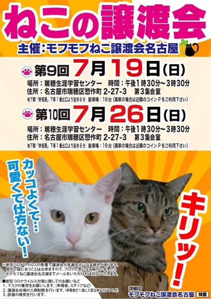 | イベント内容 | モフモフねこ譲渡会名古屋 猫たちの幸せなお家探しのために譲渡会を開催しております。 個人ボランティアの集まりです。 自分たちの出来ることから頑張っております! 一匹でも幸せになれる猫が増えますように 場所 瑞穂生涯学習センター 第3集会室 住所 名古屋市瑞穂区惣作町2-27-3 時間 13時30分~15時30分 交通機関等 地下鉄「妙音通」下車1番出口より徒歩8分 駐車場19台(満車の場合は近隣コインPをご利用ください) 参加猫の情報は下記モフモフねこ譲渡会名古屋ブログにてご確認ください。 https://mofumofuneko4.fc2.net/ 新型コロナウイルス対策として ・会場は換気を定期的に行います。 ・密を避けるため、入場制限をさせていただきます。 ・入口にて手指の消毒、検温をお願いいたします。 ・ご来場の際はマスク着用をお願いいたします。 ・咳・発熱・倦怠感等の体調のすぐれない方はご来場を控えていただきますよう、お願いいたします。 【譲渡会について】 ・譲渡会は入場無料、予約不要です。お気軽にご参加ください。 ・会場へのお問い合わせはご遠慮ください。 ご質問は下記メールアドレスへお願いいたします。 mofumofuneko4☆gmail.com ☆を@に変更してお問い合わせください。 ・猫の引き取りはしておりません。 ・譲渡会当日に猫をお渡しすることはありません。 ・保護主によって譲渡条件が違う場合があります。 ・参加予定でも譲渡会前にトライアルになる場合があります。 ご希望の猫がいましたらまずはお問い合わせをお願いいたします。 【参加猫について】 ・ノミ駆除、駆虫、トイレ躾、ワクチン3種接種済。 ・年齢や健康状態に応じて、避妊手術を行っております。 ・参加予定で紹介していても当日体調不良等で欠席になる場合があります。 【譲渡の約束事】 ・ペット飼育可の住宅にお住まいの方。 ・完全室内飼育。 ・脱走防止の対策をしていただける方。 ・避妊手術未実施の場合、避妊手術 の実施と報告をしていただける方。 ・ご家族全員が猫を飼うことに同意していること。 ・譲渡後、しばらく定期連絡を入れていただける方。 *お一人暮らしの方、60歳以上の方は、身内の方の保証を必要となる場合がございます。 #名古屋瑞穂区 #瑞穂生涯学習センター #譲渡会 #保護猫 #地域猫 #さくらねこ #tnr #里親募集 #里親募集中 #猫 #ねこ #殺処分ゼロ #買わずに飼おう #モフモフねこ譲渡会名古屋 #ペットショップに行く前に #譲渡会のお知らせ #猫と暮らしたい |