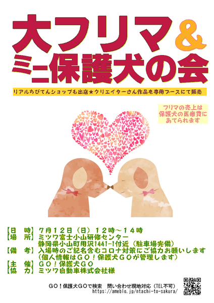 | イベント内容 | 保健所・殺処分場・ブリーダーから保護した犬達の医療費をねん出するためのフリマです。 全国から届いたお品を、GO!保護犬GO応援隊・美女軍団がお売りさせていただきます。 ★新品・美品・高級品多数 ★100円でいいの? ブース開設 【主催】GO!保護犬GO 【日時】7月12日 12時~14時 雨天OK・屋内開催 【場所】ミツワ富士小山研修センター エントランスホール&研修ルーム 【その他】隣の部屋では『GO!保護犬GO 保護犬の会ミニ』を同時開催します。 お買い物のついでに、そちらものぞいてみてください。 お買上の売上は全額、保護犬の体のために利用させていただきます。 詳細は下記ホームページをご覧ください 電話・メールでの問い合わせ不可(返信しません) GO!保護犬GO~知る・見る・伝える→殺処分ゼロへ https://ameblo.jp/ntachi-to-sakura/ |