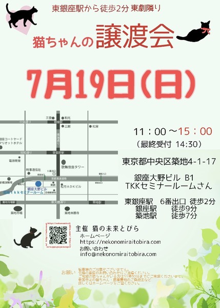 | イベント内容 | 東銀座で保護猫の譲渡会を開催しています「猫の未来とびら」です♪ 恵まれない環境にいる猫たちが未来へのとびらを開いて幸せなご縁に繋がる橋渡しをしていきます。 たくさんの猫ちゃんと保護主・スタッフ一同みなさまのご来場を心よりお待ちしています! 子猫ちゃん〜成猫ちゃんまで参加します♪ ご来場頂く方と私たち保護主、スタッフの安心と安全の為、感染リスクを限りなく低減させる為、私たちが出来うる対策をしてお待ちしております。 【ご来場いただく皆様には下記についてお願い致します】 ★マスクの着用をお願い致します。 (マスク着用のない方は入場出来ません) ★譲渡会場にお入り頂く前に手洗いと手の消毒をお願い致します。 ★ソーシャル・ディスタンス(人と人との間隔を開ける)をお願い致します。 ★熱のある方や体調の優れない方は譲渡会への来場を見合わせて頂けますよう、お願い致します。 ★来場者数によりましては人数制限もありますので長時間お待たせてする場合もございます。 予めご了承下さい。 ★見学だけの方は蜜を避ける為に来場をお断りさせて頂きます。 コロナウイルス感染拡大防止の為、このような厳しいお願いで大変恐縮ですが何卒ご理解とご協力、ご了承をいただけますようお願い致します。 ★☆★★☆★★☆★★☆★★☆★★☆★★☆★★☆★★☆★ ★開催日時 2020年7月19日(日) 11:00~15:00 (最終受付 14:30) ★会場 東京都中央区築地4-1-17 銀座大野ビル B1 TKKセミナールームさんにて (東劇となり) ★最寄駅 東銀座駅 6番出口 徒歩2分 銀座駅 徒歩9分 ・築地駅 徒歩7分 駐車場のご用意はございませんので近隣のコインパーキング等をご利用ください。 会場への直接のお問い合わせはご遠慮くださいませ。 ★☆★★☆★★☆★★☆★★☆★★☆★★☆★★☆★★☆★ 会場で猫ちゃんと触れ合ってご縁を繋いでください。 里親様・猫ちゃんが双方、幸せな家族になれるよう保護主・スタッフがサポート致します。 ご不安な事はお気軽にご相談ください。 入場無料です。事前のご予約は必要ございません。 ご希望の猫ちゃんがいらっしゃる里親希望者様は11時~11時30分までに会場へお越しください。 11時30分までに受付されたすべての里親希望者様と保護主がお話をさせて頂き 1匹に複数のお申込み、里親様と猫ちゃんに合うご家庭がございましたら 受付を終了する場合もございます。 里親様が決まっていない猫ちゃんに関しましては随時保護主とご相談ください。 当日猫ちゃんの引き渡しはございません。 後日、保護主が里親様宅へお届けいたします。 ※参加予定猫ちゃんは、急な体調不良等で不参加になる場合もございます。 開催当日の朝、当会ブログにて不参加の最新情報を掲載致しますのでご確認をお願い申し上げます。 ◇譲渡に関してのお願い・基本条件 1.家族の一員として終生最期まで愛育下さい。 2.完全室内飼い・ペット可のお住まい 3.脱走防止対策 4.避妊・去勢手術 5.里親様のご自宅へのお届け 6.譲渡誓約書への署名捺印・身分証明書の提示 7.医療費譲渡金のご負担 8.定期報告 9.トライアル期間有り ※保護主により譲渡条件は異なりますので会場で直接ご相談ください。 60才以上の方のみのご家庭、未成年の方、単身の方、同棲中の方、 必要な脱走対策を施していただけない方は譲渡が難しい場合もございますのでご了承ください。 小さな子猫の譲渡は体重が1kgになってからのお届けやお留守番の無い(少ない)ご家庭を希望いたします。 医療費譲渡金に関しましては詳しくはホームページの 【譲渡に関してのお願い】【譲渡の流れ】をご覧くださいませ。 〜主催 猫の未来とびら〜 |