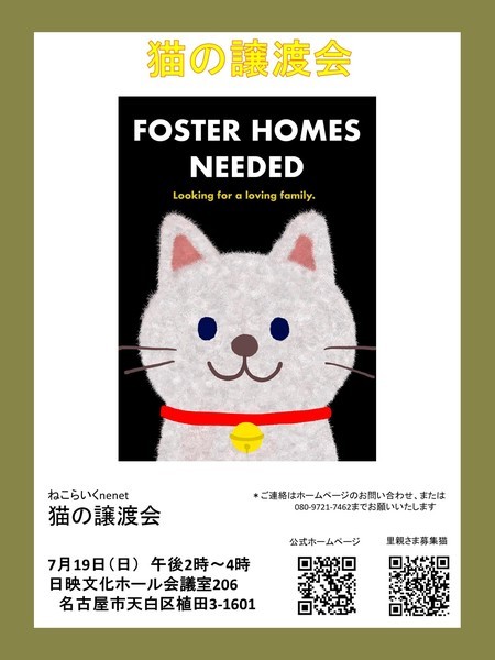 | イベント内容 | 保護猫の里親になりませんか? 《猫の譲渡会のお知らせ》 主催:ねこらいくnenet 日にち:7月19日 (日曜日) 時間 :午後2時~4時 会場 :名古屋市天白区植田3-1601 日映文化ホール会議室206 *建物前に専用の駐車場があります。満車の場合は コインパーキングの利用をお願いいたします。 *地下鉄鶴舞線「植田」駅より徒歩2分 〇保護猫は保護したあと、一定期間、体の状態を観察し、 トイレのしつけや基本的な健康診断を済ませています 〇それぞれの猫の特長や習慣など、現在の保護主より 説明をさせていただきます 参加猫はホームページ/募集猫たちで紹介しています https://nekolike.amebaownd.com/ (参加予定猫が体調不良などで急遽不参加になることもあります) ・譲渡会の見学は入場無料・予約不要です ・当日に猫をお渡しすることはありません 後日、ご自宅までお届けに伺います ・1週間から2週間のトライアル期間後、正式譲渡となります ・完全室内飼い・ご家族全員の同意・治療費の一部ご負担などお願い事項があります 詳しくはホームページ/譲渡についてをご覧ください https://nekonetwork.com/2020/03/31/03/58/35/2671/譲渡について/ *感染症の拡大防止のためご協力をお願いいたします 〇会場は窓を開放し、常に換気をしています 〇マスクの装着をお願いいたします 〇入り口には消毒薬を用意しています 〇会場内への入室は一定の人数とさせていただきます |