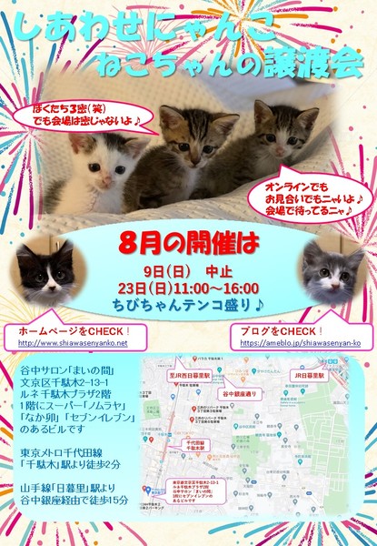 | イベント内容 | ※諸事情により開催は中止となりました。 「しあわせにゃんこ」は行き場のない猫ちゃんと里親様との出会いの場を提供するグループです♪ 子猫も成猫もハンデのある猫もみんな新しい家族を待っています♪ みなさまのご来場を保護主、スタッフ一同心よりお待ちしております♪ 開催にあたりソーシャルディスタンスを守る為、各種制限等を設けております。 ※詳しくはブログをご確認願います。 https://ameblo.jp/shiawasenyan-ko/entry-12610605619.html 猫好きの聖地「谷根千」にて皆様のご来場をお待ちしております♪ ◆開催日/開催時間◆ 2020年8月9日(日) 11:00~16:00 ご希望の猫ちゃんがいらっしゃる場合は11時30分までに受付をお願い致します。 複数のお申し込みがある場合は11時30分で受付を終了させて頂く場合がございます。 受付をされた全ての里親様とお見合いをさせて頂きます。 ※先着順ではございません。 ※当日、猫ちゃんを連れて帰ることは出来ません。 後日調整のうえ保護主が里親様宅へお届けいたします。 ◆会場◆ 東京都文京区千駄木2-13-1 ルネ千駄木プラザ2階 谷中サロン「まいの間」 ※詳しいアクセスはHPをご覧下さい http://www.shiawasenyanko.net/jyoutokai.html 谷中サロン「まいの間」の情報はこちら http://neko-to-kyo.com/#maima ◆交通手段◆ 東京メトロ千代田線「千駄木」駅より徒歩2分 JR山手線「西日暮里」駅より徒歩12分 JR山手線「日暮里」駅より谷中銀座経由で徒歩15分 ※お車でご来場の際、駐車場のご用意はございません。 近隣のコインパーキング等をご利用ください。※近隣に沢山あります。 いつ里の掲載参加猫一覧はこちらから https://satoya-boshu.net/mypage/foster_list.php?@ps@=none アメーバブログの里親募集にゃんこはこちら https://ameblo.jp/shiawasenyan-ko/theme-10092719565.html ◆猫ちゃんとのお見合い◆ 掲載している猫ちゃんは基本的に譲渡会場でのお見合いのみとなります。 譲渡会への参加が決定している猫ちゃんはその譲渡会で里親様が決定しなかった場合のみ保護主宅でのお見合いが可能となります。 自宅お見合いを希望される里親様はメール(info@shiawasenyanko.net)にてご相談ください。 ◆当譲渡会では猫ちゃんと里親様のスキンシップを大切にしています◆ 新しい家族として20年以上いっしょに暮らしていく猫ちゃんです。 譲渡会場でたくさんの猫ちゃんと触れ合って良きパートナーを見つけてください。 はじめて猫ちゃんを迎える不安や先住猫ちゃんとのトライアルの注意点、猫ちゃんと里親様の暮らし方など気軽にご相談ください。 経験豊富な保護主や猫大好きスタッフがアドバイスさせていただきます。 ◆子猫ご希望の里親様◆ 子猫は急な下痢や発熱等により体調が急変し、数時間対応ができなかっただけでも命を落とす事があります。 その為、当譲渡会では月齢によりお留守番のない又は少ないご家庭への譲渡に限らせて頂いております。 また里親様と子猫ちゃんが安心してトライアル期間を過ごせるよう体重が1㎏程になってからのお届けとさせて頂いております。 ◆里親希望のみなさまへ◆ ご家族の皆様で生涯、家族の一員としてたっぷり愛情を注いでくださるご家庭をお待ちしております。 下記に該当する希望者様へ ・独身、単身者の方 ・友人同士、同棲でのお住まいの方 ・高齢者のみのご家庭の方 は、ご相談の上、譲渡を判断させて頂きます ・適正飼育の不可能な方 ・脱走防止対策にご協力頂けない方 ・定期報告の不可能な方 は、ご遠慮下さいますようお願い致します ◆ご負担頂く費用について◆ 譲渡の際に譲渡負担金(医療費の一部、譲渡金、お届け時の交通費)を里親様にご負担頂く事により 過酷な状況にいる猫ちゃんを保護し新しいご家族の元へ送り出す事ができています。 皆様のご理解とご協力にボランティア一同、心より感謝しております。 ご負担頂く医療費につきましてはホームページに詳しく記載させて頂いております。 http://www.shiawasenyanko.net/onegai.html しあわせにゃんこホームページ http://www.shiawasenyanko.net メールでのお問い合わせ info@shiawasenyanko.net |