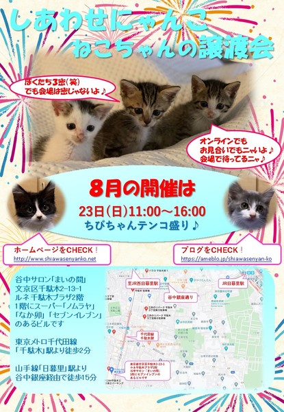 | イベント内容 | 「しあわせにゃんこ」は行き場のない猫ちゃんと里親様との出会いの場を提供するグループです♪ 子猫も成猫もハンデのある猫もみんな新しい家族を待っています♪ みなさまのご来場を保護主、スタッフ一同心よりお待ちしております♪ 2020年夏!最後の譲渡会♪ にゃんことゆっくり過ごしませんか? 開催にあたりソーシャルディスタンスを守る為、各種制限等を設けております。 ※詳しくはブログをご確認願います。 https://ameblo.jp/shiawasenyan-ko/entry-12610605619.html 猫好きの聖地「谷根千」にて皆様のご来場をお待ちしております♪ ◆開催日/開催時間◆ 2020年8月23日(日) 11:00~16:00 ご希望の猫ちゃんがいらっしゃる場合は11時30分までに受付をお願い致します。 複数のお申し込みがある場合は11時30分で受付を終了させて頂く場合がございます。 受付をされた全ての里親様とお見合いをさせて頂きます。 ※先着順ではございません。 ※当日、猫ちゃんを連れて帰ることは出来ません。 後日調整のうえ保護主が里親様宅へお届けいたします。 ◆会場◆ 東京都文京区千駄木2-13-1 ルネ千駄木プラザ2階 谷中サロン「まいの間」 ※詳しいアクセスはHPをご覧下さい http://www.shiawasenyanko.net/jyoutokai.html 谷中サロン「まいの間」の情報はこちら http://neko-to-kyo.com/#maima ◆交通手段◆ 東京メトロ千代田線「千駄木」駅より徒歩2分 JR山手線「西日暮里」駅より徒歩12分 JR山手線「日暮里」駅より谷中銀座経由で徒歩15分 ※お車でご来場の際、駐車場のご用意はございません。 近隣のコインパーキング等をご利用ください。※近隣に沢山あります。 いつ里の掲載参加猫一覧はこちらから https://satoya-boshu.net/mypage/foster_list.php?@ps@=none アメーバブログの里親募集にゃんこはこちら https://ameblo.jp/shiawasenyan-ko/theme-10092719565.html ◆猫ちゃんとのお見合い◆ 掲載している猫ちゃんは基本的に譲渡会場でのお見合いのみとなります。 譲渡会への参加が決定している猫ちゃんはその譲渡会で里親様が決定しなかった場合のみ保護主宅でのお見合いが可能となります。 自宅お見合いを希望される里親様はメール(info@shiawasenyanko.net)にてご相談ください。 ◆当譲渡会では猫ちゃんと里親様のスキンシップを大切にしています◆ 新しい家族として20年以上いっしょに暮らしていく猫ちゃんです。 譲渡会場でたくさんの猫ちゃんと触れ合って良きパートナーを見つけてください。 はじめて猫ちゃんを迎える不安や先住猫ちゃんとのトライアルの注意点、猫ちゃんと里親様の暮らし方など気軽にご相談ください。 経験豊富な保護主や猫大好きスタッフがアドバイスさせていただきます。 ◆子猫ご希望の里親様◆ 子猫は急な下痢や発熱等により体調が急変し、数時間対応ができなかっただけでも命を落とす事があります。 その為、当譲渡会では月齢によりお留守番のない又は少ないご家庭への譲渡に限らせて頂いております。 また里親様と子猫ちゃんが安心してトライアル期間を過ごせるよう体重が1㎏程になってからのお届けとさせて頂いております。 ◆里親希望のみなさまへ◆ ご家族の皆様で生涯、家族の一員としてたっぷり愛情を注いでくださるご家庭をお待ちしております。 下記に該当する希望者様へ ・独身、単身者の方 ・友人同士、同棲でのお住まいの方 ・高齢者のみのご家庭の方 は、ご相談の上、譲渡を判断させて頂きます ・適正飼育の不可能な方 ・脱走防止対策にご協力頂けない方 ・定期報告の不可能な方 は、ご遠慮下さいますようお願い致します ◆ご負担頂く費用について◆ 譲渡の際に譲渡負担金(医療費の一部、譲渡金、お届け時の交通費)を里親様にご負担頂く事により 過酷な状況にいる猫ちゃんを保護し新しいご家族の元へ送り出す事ができています。 皆様のご理解とご協力にボランティア一同、心より感謝しております。 ご負担頂く医療費につきましてはホームページに詳しく記載させて頂いております。 http://www.shiawasenyanko.net/onegai.html しあわせにゃんこホームページ http://www.shiawasenyanko.net メールでのお問い合わせ info@shiawasenyanko.net |