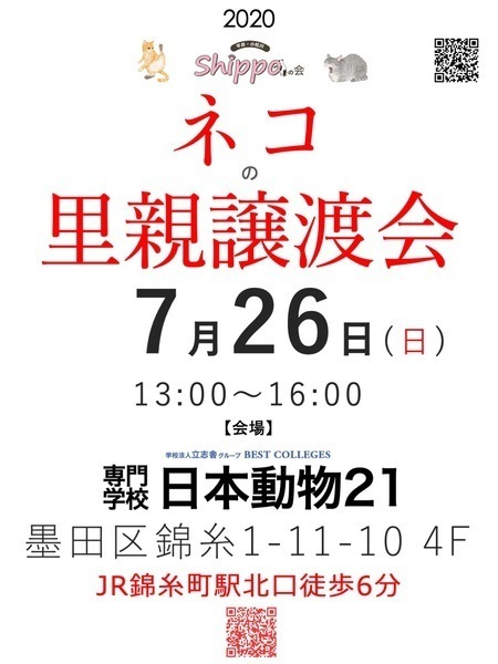 | イベント内容 | 錦糸町の専門学校日本動物21様のご協力により、同校舎で猫の里親譲渡会を開催させていただくことになりました。 感染防止対策として、ご来場の際はマスク着用、入り口でのアルコール消毒、検温のご協力をお願いしております。 ご入場については当日12:30受付開始、検温、問診票・アンケートへの記入をしていただきます。 『三密』を避けるため、以下のように対応させていただきます。 *会場入場者数は1回に20名前後になります *ご来場者さまの数によりますが、60分程度での入替制(13:00〜/14:00〜/15:00〜) *窓を開けての外気換気を行いますので、猫さんをケージの外に出すことはできません *会場には待機場所のご用意はございません (当日の来場者数により、入場できない場合がございます) 以上、ご理解いただきますよう、お願いいたします。 参加猫さんはこちらからご覧下さい。(随時更新) ↓ https://www.pet-home.jp/member/user360938/post/ 平井・小松川Shippoの会が投稿した里親募集 https://www.pet-home.jp/member/user247571/post/ てんきちfamilyが投稿した里親募集 ●日時:7月26日(日)13:00~16:00(入場受付:12:30より) ●会場:専門学校 日本動物21 墨田区錦糸1-11-10 4F ●アクセス:JR総武線・総武快速線「錦糸町駅」 北口徒歩6分 東京メトロ半蔵門線「錦糸町駅」 3出口徒歩6分 ※東京都墨田区錦糸1-2-1(アルカタワーズ)は同校の法人本部です。 里親譲渡会の会場ではございませんので、お間違いのないよう御願い致します。 子猫ちゃんたちも参加予定なので、小さい頃から一緒に暮らしたい、育てたいとお考えの方、ぜひお越しください! 男性の一人暮らしの方やご高齢の方にもぴったりの、まったりした大人猫さんたちも参加予定です。 きっと、運命の出会いがあると思います。 里親希望の皆さま、ぜひ、足をお運びください! ●参加猫および諸条件については、下記「ペットのおうち」からご覧ください。(随時更新) https://www.pet-home.jp/member/user360938/post/ |