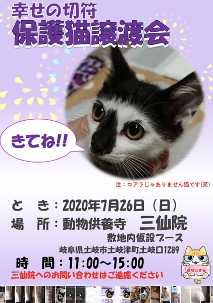| イベント内容 | 幸せの切符】 猫の譲渡会のお知らせです。 ■とき:7月26日(日) ■場所:動物供養 【三仙院 】(土岐市土岐津町土岐口1289) ■時間:11:00~15:00 (準備等で若干遅れる可能性がございます) (遠方保護主が多い為、10:30~11:00頃、猫が揃い始めます) ■参加動物:当日の体調により変動します ★生後3ヶ月~2歳猫 ※譲渡会に参加していない子もいます。写真を用意していますので、保護主さん宅でお見合いすることも可能です。 ***************************************************** ★詳細は各ホームページをご覧ください。参加猫の日々をつづっています。 【幸せの切符】 http://happyticket.blog133.fc2.com/ 【猫小屋の住人たち】 http://nekogoyaokan.blog.fc2.com/ 【Harelu】 http://120310210831.blog.fc2.com/ ※三仙院へ直接のお問い合わせやご相談はご遠慮願います ★★お問い合わせ先★★ メール: happyticket_gifu@yahoo.co.jp 電話 : 050-1377-3880 ■20時以降のみの対応となります ■留守電になった場合は、番号と用件を残してください。 2~3日以内に折返しご連絡いたします。 ※当日渡しは行っておりません。 ※アンケート記入をしていただき、後日お届けさせていただきます。 ※先着順ではございません |