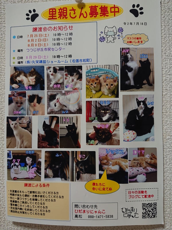 | イベント内容 | 保護猫の譲渡会です。 子猫たくさんきます。 落ちついた成猫さんもきます。 猫の可愛いハンドメイド雑貨も、販売致します。 詳細は アメブロ「ひだまりにゃんこ」を ご覧ください。 |