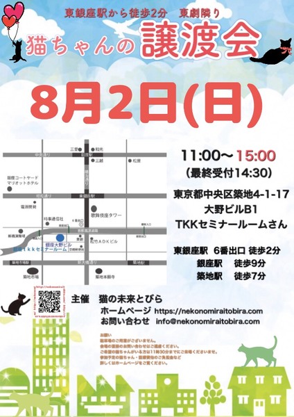 | イベント内容 | 東銀座で保護猫の譲渡会を開催しています「猫の未来とびら」です♪ 恵まれない環境にいる猫たちが未来へのとびらを開いて幸せなご縁に繋がる橋渡しをしていきます。 たくさんの猫ちゃんと保護主・スタッフ一同みなさまのご来場を心よりお待ちしています! 子猫ちゃん〜成猫ちゃんまで参加します♪ ご来場頂く方と私たち保護主、スタッフの安心と安全の為、感染リスクを限りなく低減させる為、私たちが出来うる対策をしてお待ちしております。 【ご来場いただく皆様には下記についてお願い致します】 ★マスクの着用をお願い致します。 (マスク着用のない方は入場出来ません) ★譲渡会場にお入り頂く前に手洗いと手の消毒をお願い致します。 ★ソーシャル・ディスタンス(人と人との間隔を開ける)をお願い致します。 ★熱のある方や体調の優れない方は譲渡会への来場を見合わせて頂けますよう、お願い致します。 ★来場者数によりましては人数制限もありますので長時間お待たせてする場合もございます。 予めご了承下さい。 ★見学だけの方は蜜を避ける為に来場をお断りさせて頂きます。 コロナウイルス感染拡大防止の為、このような厳しいお願いで大変恐縮ですが何卒ご理解とご協力、ご了承をいただけますようお願い致します。 ★☆★★☆★★☆★★☆★★☆★★☆★★☆★★☆★★☆★ ★開催日時 2020年8月2日(日) 11:00~15:00 (最終受付 14:30) ★会場 東京都中央区築地4-1-17 銀座大野ビル B1 TKKセミナールームさんにて (東劇となり) ★最寄駅 東銀座駅 6番出口 徒歩2分 銀座駅 徒歩9分 ・築地駅 徒歩7分 駐車場のご用意はございませんので近隣のコインパーキング等をご利用ください。 会場への直接のお問い合わせはご遠慮くださいませ。 ★☆★★☆★★☆★★☆★★☆★★☆★★☆★★☆★★☆★ 会場で猫ちゃんと触れ合ってご縁を繋いでください。 里親様・猫ちゃんが双方、幸せな家族になれるよう保護主・スタッフがサポート致します。 ご不安な事はお気軽にご相談ください。 入場無料です。事前のご予約は必要ございません。 ご希望の猫ちゃんがいらっしゃる里親希望者様は11時~11時30分までに会場へお越しください。 11時30分までに受付されたすべての里親希望者様と保護主がお話をさせて頂き 1匹に複数のお申込み、里親様と猫ちゃんに合うご家庭がございましたら 受付を終了する場合もございます。 里親様が決まっていない猫ちゃんに関しましては随時保護主とご相談ください。 当日猫ちゃんの引き渡しはございません。 後日、保護主が里親様宅へお届けいたします。 ※参加予定猫ちゃんは、急な体調不良等で不参加になる場合もございます。 開催当日の朝、当会ブログにて不参加の最新情報を掲載致しますのでご確認をお願い申し上げます。 ◇譲渡に関してのお願い・基本条件 1.家族の一員として終生最期まで愛育下さい。 2.完全室内飼い・ペット可のお住まい 3.脱走防止対策 4.避妊・去勢手術 5.里親様のご自宅へのお届け 6.譲渡誓約書への署名捺印・身分証明書の提示 7.医療費譲渡金のご負担 8.定期報告 9.トライアル期間有り ※保護主により譲渡条件は異なりますので会場で直接ご相談ください。 60才以上の方のみのご家庭、未成年の方、単身の方、同棲中の方、 必要な脱走対策を施していただけない方は譲渡が難しい場合もございますのでご了承ください。 小さな子猫の譲渡は体重が1kgになってからのお届けやお留守番の無い(少ない)ご家庭を希望いたします。 医療費譲渡金に関しましては詳しくはホームページの 【譲渡に関してのお願い】【譲渡の流れ】をご覧くださいませ。 〜主催 猫の未来とびら〜 |