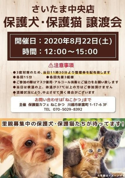 | イベント内容 | 保護犬・保護猫を家族に迎えませんか? 家族を必要としている犬猫たちが待っています。 コロナウィルス感染防止の為、下記の点にご協力をお願い致します。 ●11:30より整理券配布、各回15分/各先着3組様 ●マスク着用・アルコール消毒・検温のご協力お願いします。 |
