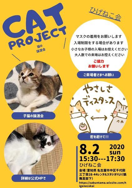 | イベント内容 | 保健所からねこのレスキューをしているひげねこ会メンバーです。 ちびねこ達が参加します。 ☆会場 愛知県 名古屋市中区千代田三丁目28-44 レンタルスタジオYUI(鶴舞高架下) ☆15:30~17:30まで JR・地下鉄鶴舞駅から徒歩5分 ☆駐車場 鶴舞交差点~南のJR中央線ガード西側道路は休日駐車禁止解除になっています。 (休日駐禁解除区間に空きが無い場合は、コインパーキングをご利用ください。) 事前のお申込みは不要です。直接会場まで足をお運びください。 里親募集中のねこ達を https://sabuntama.wixsite.com/higenecokai ひげねこ会HPで紹介しています。 ※※譲渡会でのお願い※※ 愛知県でのコロナ感染拡大が増加傾向にある事を踏まえ、制限を設けています。 https://ameblo.jp/higenekokai/entry-12614608709.html ご来場前に、ご一読ください。 皆様には大変ご不便をおかけしますが、ご理解ご協力のほどよろしくお願いいたします。 |